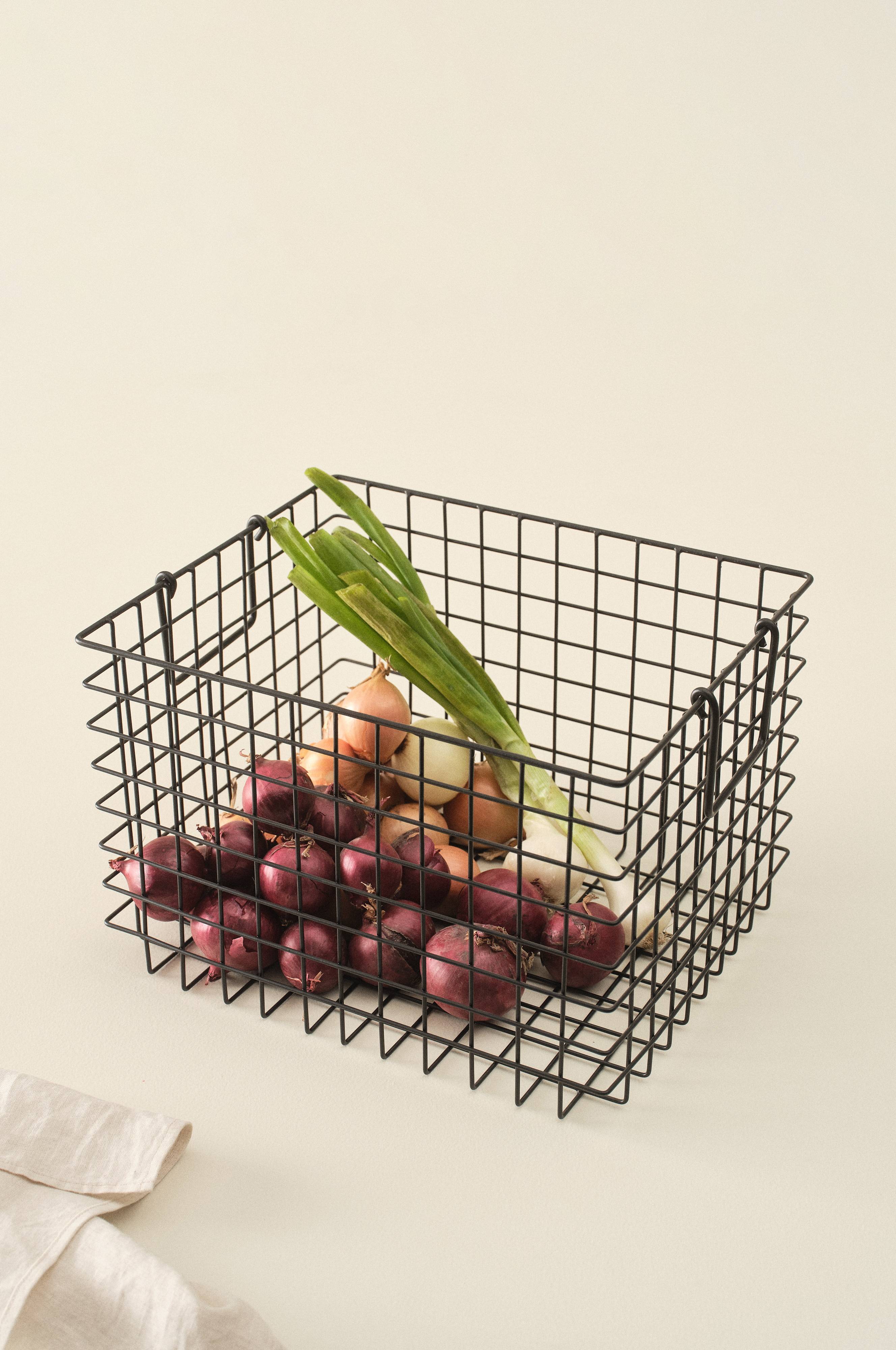 Ein Korb aus mattiertem Eisendraht. Der Drahtkorb hat Griffe zum Hochklappen an den kurzen Seiten. Ein Drahtkorb ist ein echter Allrounder: Er dient zum Ordnunghalten in Schubladen und Schränken, mit Obst gefüllt zur Dekoration in der Küche und im Flur zum Verstauen von Handschuhen u.ä. Im Kinderzimmer bietet er einen guten Überblick über alle Lieblingsspielsachen.