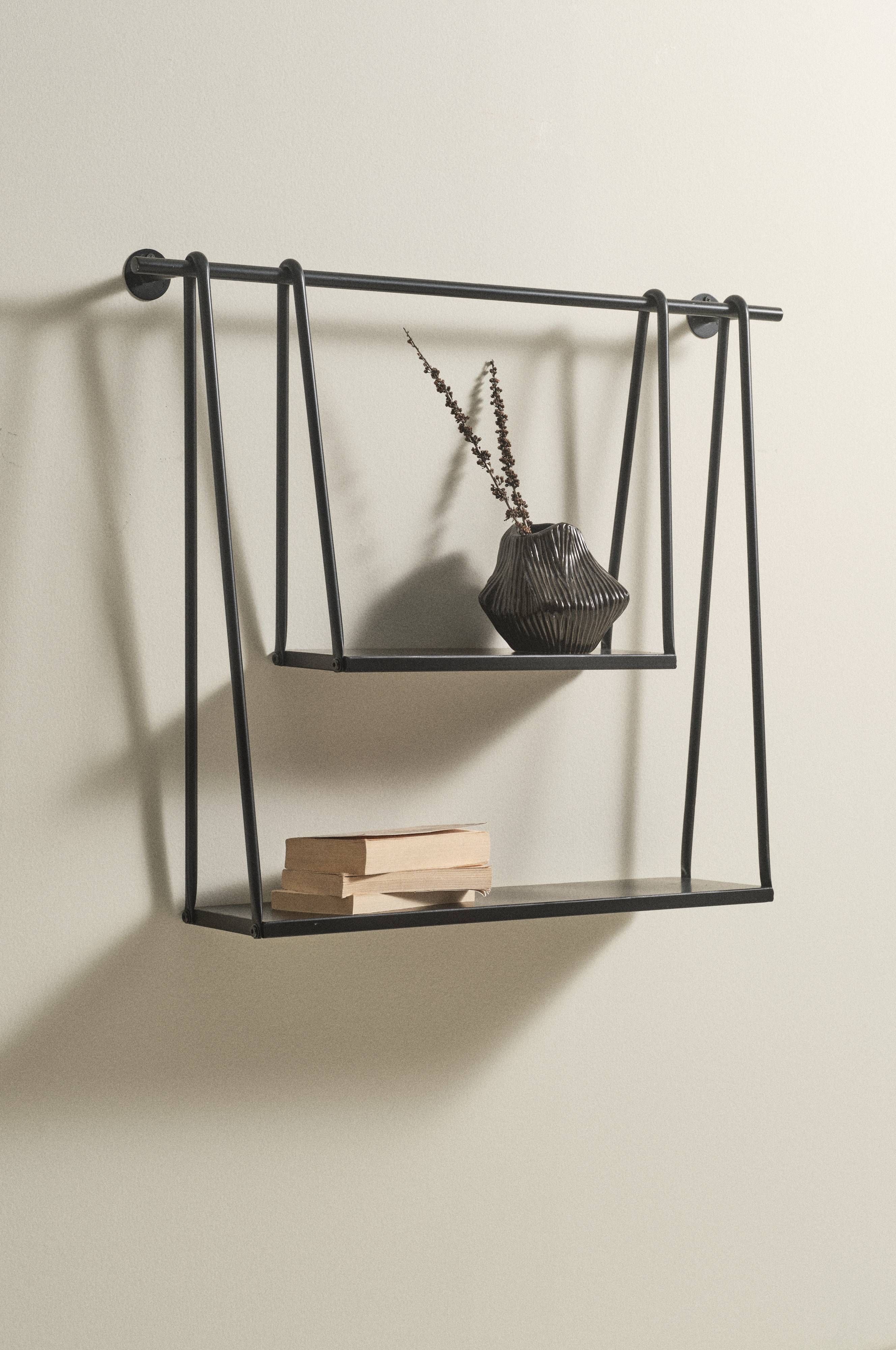 Wandregal aus Eisen in einem ausgefallenen Design. Die beiden Regale hängen an einer Stange, die an die Wand geschraubt wird. Das kleinere Regal ist schmaler und weniger tief. Dieses Wandregal ist ebenso praktisch wie dekorativ - perfekt z.B. in der Diele. Das Regal ist mit ölbasiertem Lack überzogen.