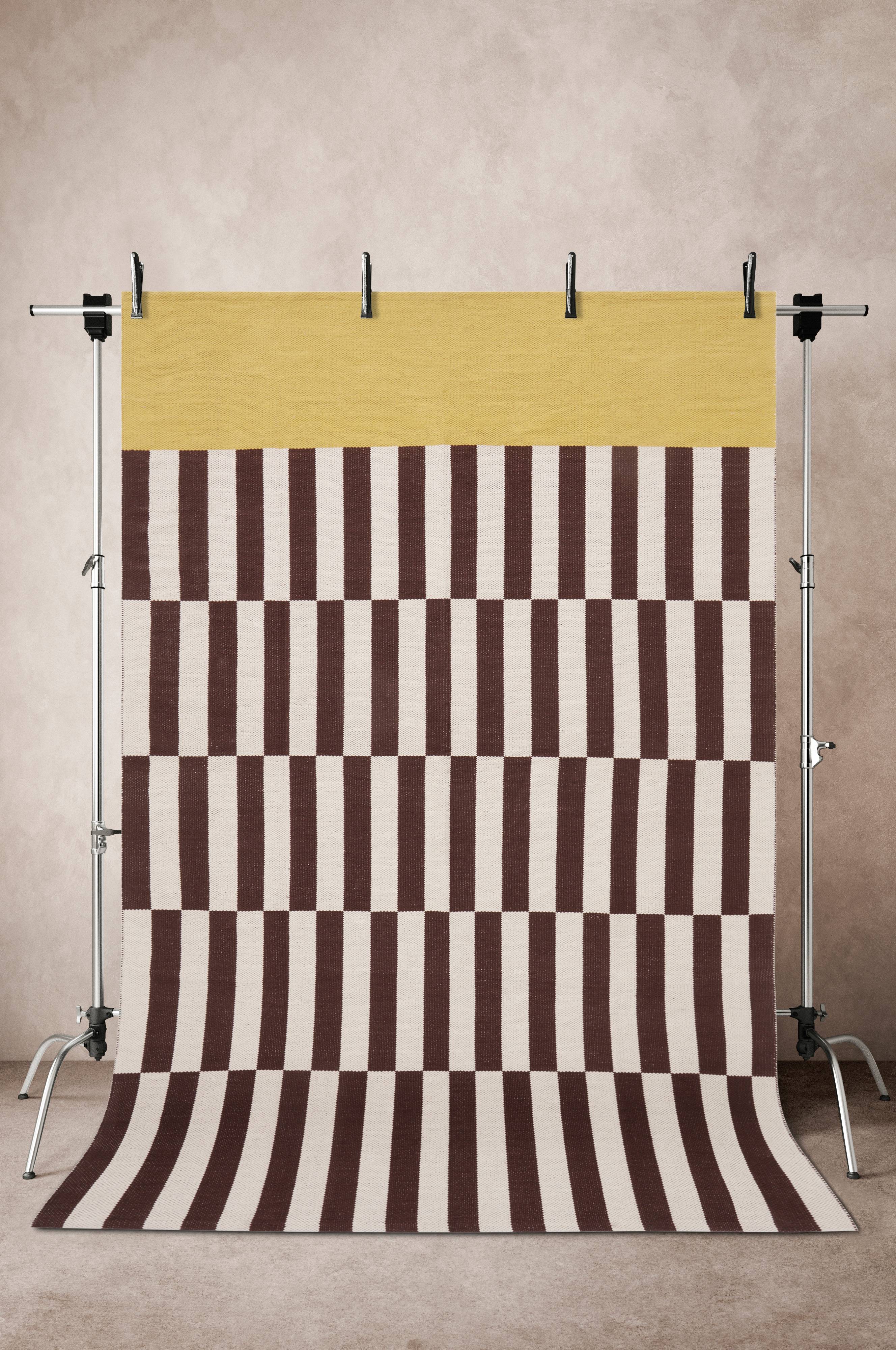 Handgefertigter Flachgewebeteppich aus Baumwolle mit einem garngefärbten Muster. Die Streifen bilden bei diesem Teppich ein Karomuster. An den Stirnseiten hat er eine breite einfarbige Bordüre und eine stabile Kante. Dicke 0,5 cm. 1200 g/m².