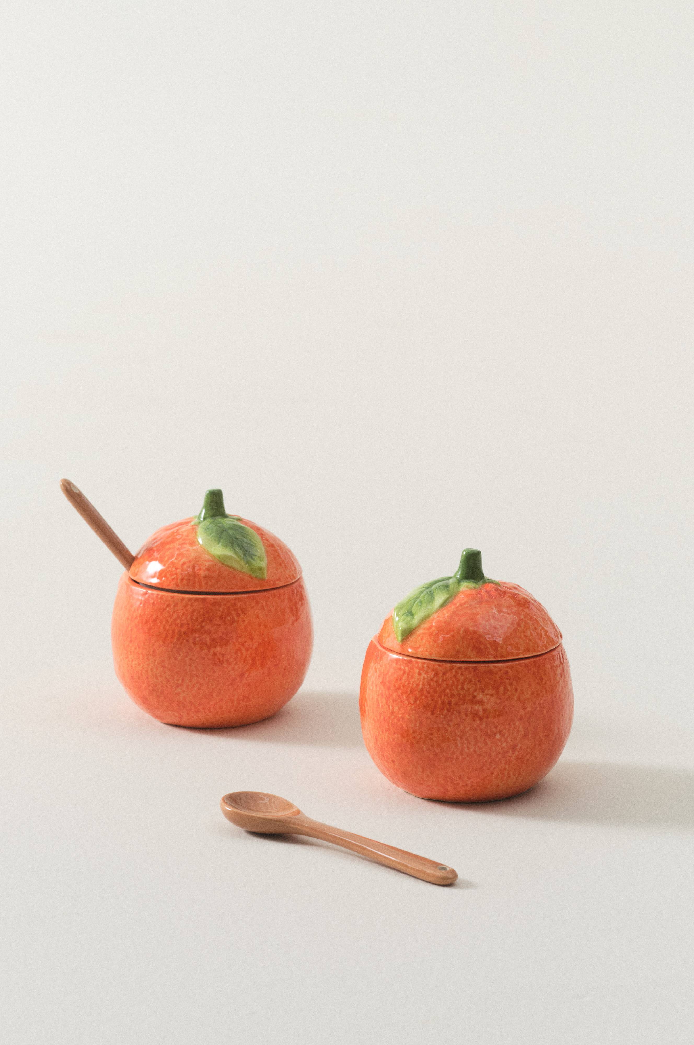2er-Set bestehend aus einer Schale in Form einer Orange mit zugehörigem Deckel. Alle Teile aus Dolomit-Porzellan. Die Schale hat eine schöne, farbintensive Glasur erhalten. Die klassische Zuckerschale hat ein kleines Loch im Deckel, sodass der Löffel die ganze Zeit in der Schale liegen kann. Natürlich kann die Schale auch für andere Zutaten verwendet werden. Auch die Innenseite ist glasiert.
