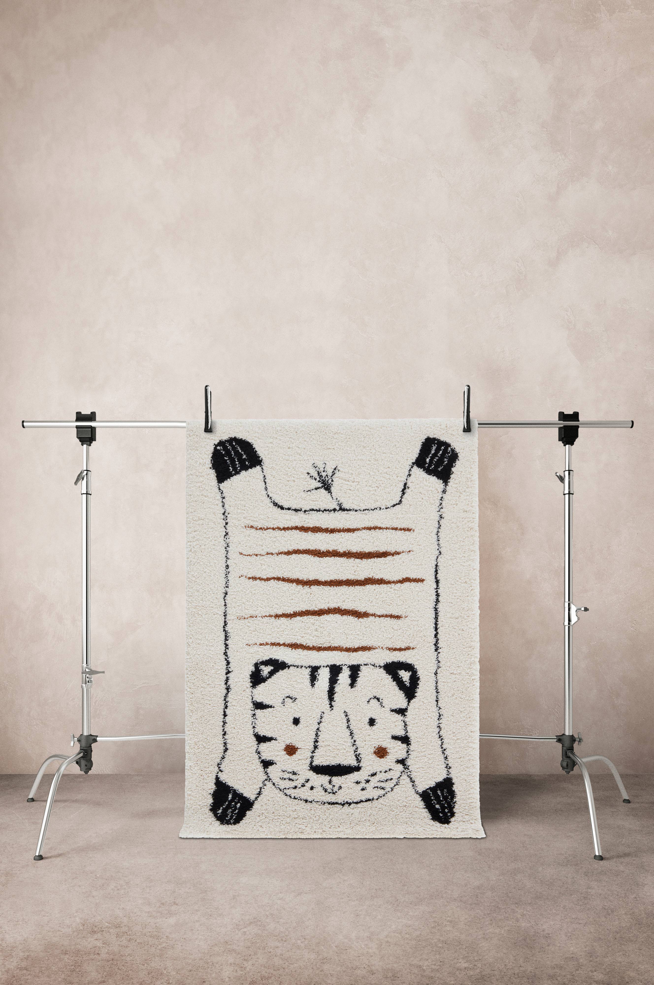 Weicher Teppich aus Polypropylen, Jute und Polyester, mit dichtem flauschigen Flor. Das Modell schmückt sich mit einem fantasievollen Tigermotiv auf hellem Grund. Im Kinder- oder Spielzimmer dient der weiche Teppich als bequeme Unterlage beim Spielen auf dem Boden. Florhöhe 3,5 cm. Dicke 3,7 cm. 2400 g/m².