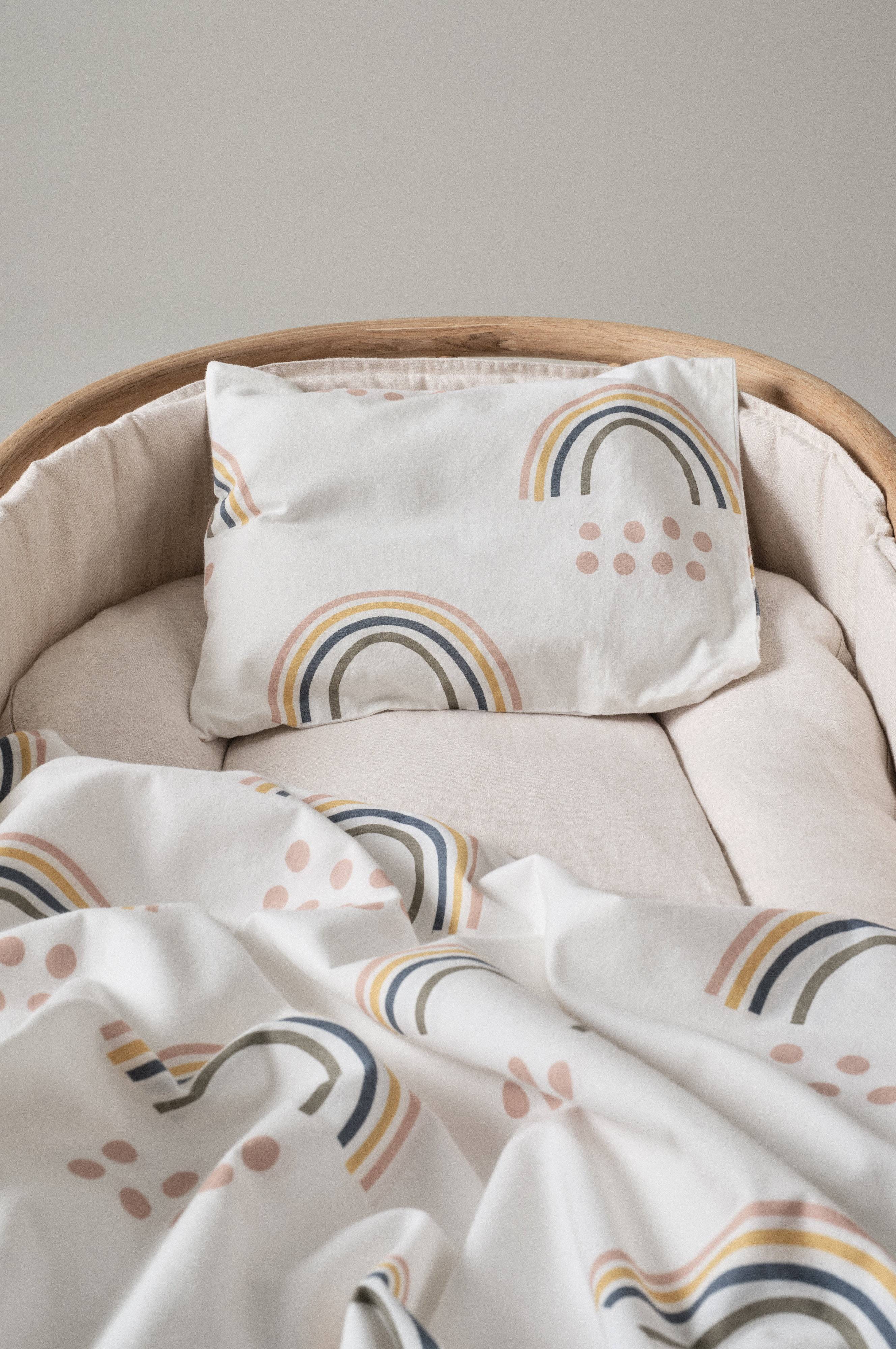 Kopfkissenbezug aus Bio-Baumwolle. Das Regenbogenmuster von ACRO zeigt sich in soften Pastelltönen auf hellem Untergrund. In weicher, kühler Bio-Baumwolle schlummert es sich überaus angenehm. Das Produkt ist stückgewaschen und daher wunderbar weich und geschmeidig. Fadendichte 144 TC. (Mit der Fadendichte bzw. dem TC-Wert (Thread Count) wird die Anzahl der Fäden in Kette und Schuss pro Quadratzoll angegeben. Je höher die Fadendichte, desto höher die Qualität. Eine Ausnahme bildet Leinen, denn hier möchte man oft durch etwas lockereres Weben die gewünschte Haptik erzielen.)
