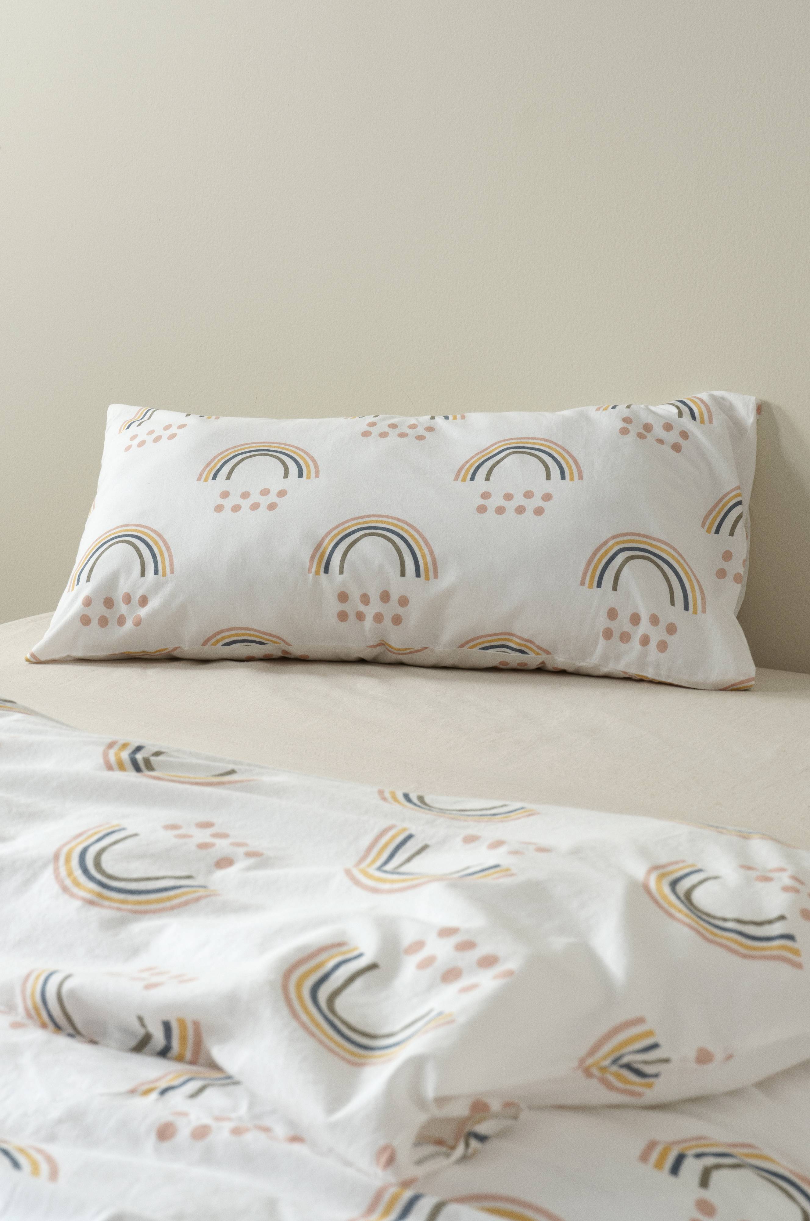 Kopfkissenbezug aus Bio-Baumwolle. Das Regenbogenmuster von ACRO zeigt sich in soften Pastelltönen auf hellem Untergrund. Bettwäsche aus kühler, weicher Bio-Baumwolle ist sehr angenehm auf der Haut. Das Produkt ist stückgewaschen und daher wunderbar weich und geschmeidig. Fadendichte 144 TC. (Mit der Fadendichte bzw. dem TC-Wert (Thread Count) wird die Anzahl der Fäden in Kette und Schuss pro Quadratzoll angegeben. Je höher die Fadendichte, desto höher die Qualität. Eine Ausnahme bildet Leinen - hier wird die gewünschte Haptik oft durch eine etwas lockerere Webart erzielt.)