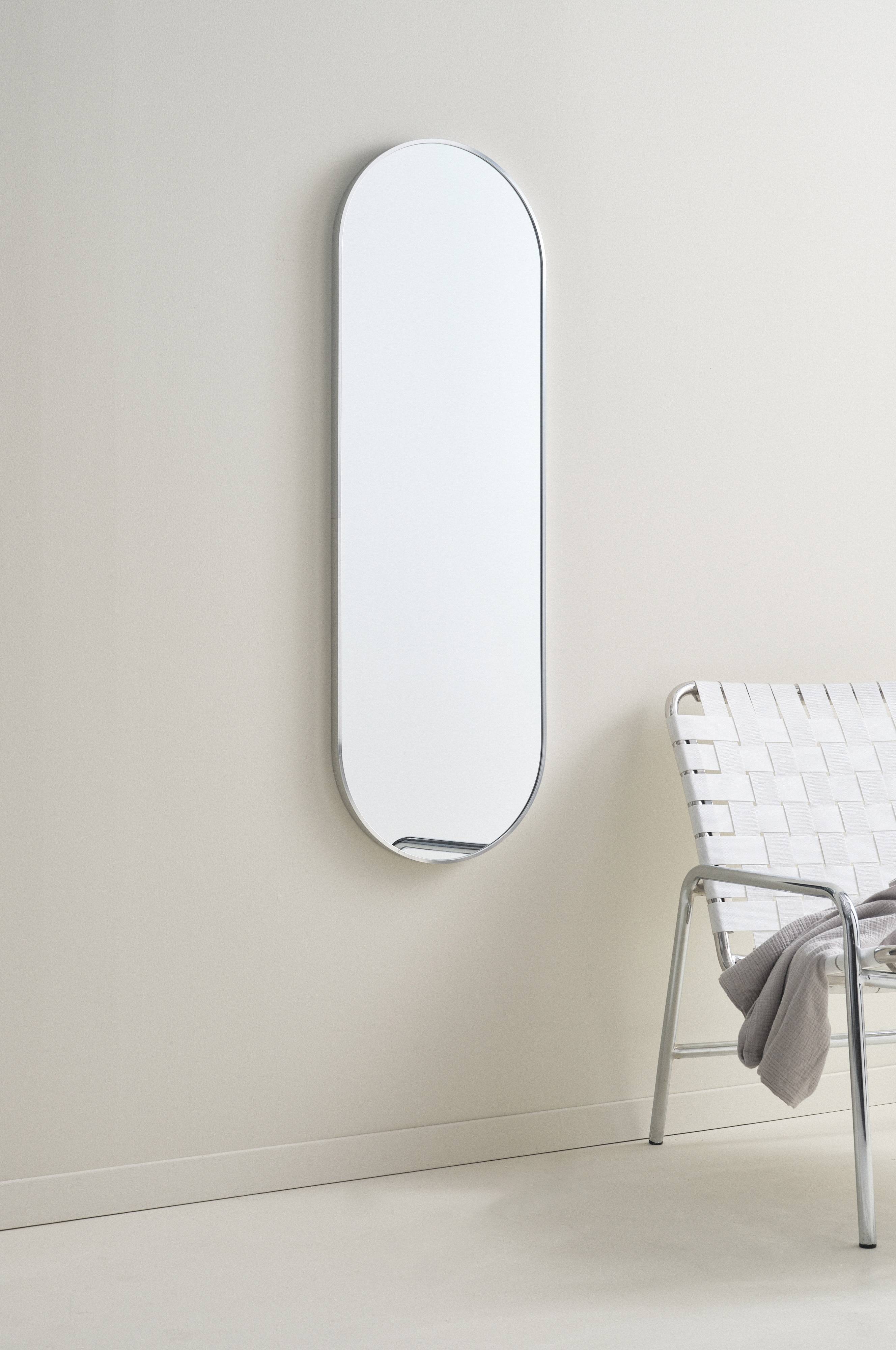 Spiegel mit feinem Aluminiumrahmen. Der Spiegel hat eine oval-längliche Form. Rückseite aus MDF. Verdeckte Aufhängung auf der Rückseite.
