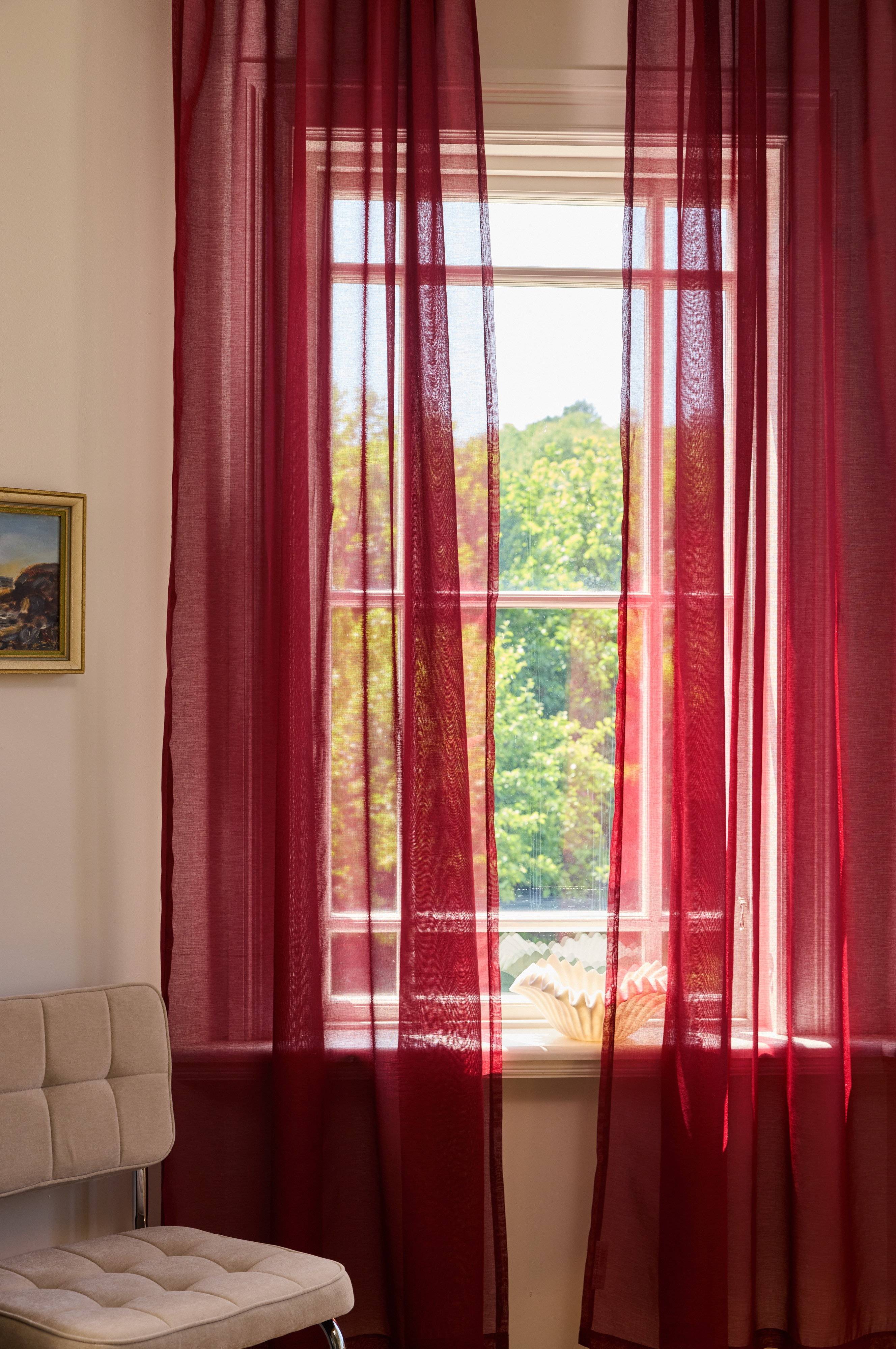 Zwei Vorhanglängen aus zartem und luftigem Voile-Polyester, der leicht fällt und viel Licht spendet. Wenn du die Vorhänge für das Fenster zuziehen willst, um etwas Privatsphäre zu haben, bekommst du trotzdem das schöne Licht. Wenn sie an der Seite des Fensters hängen, nehmen sie nicht so viel Platz ein, werden aber als ordentlicher empfunden. Das Material des Vorhangs ist recycelt.