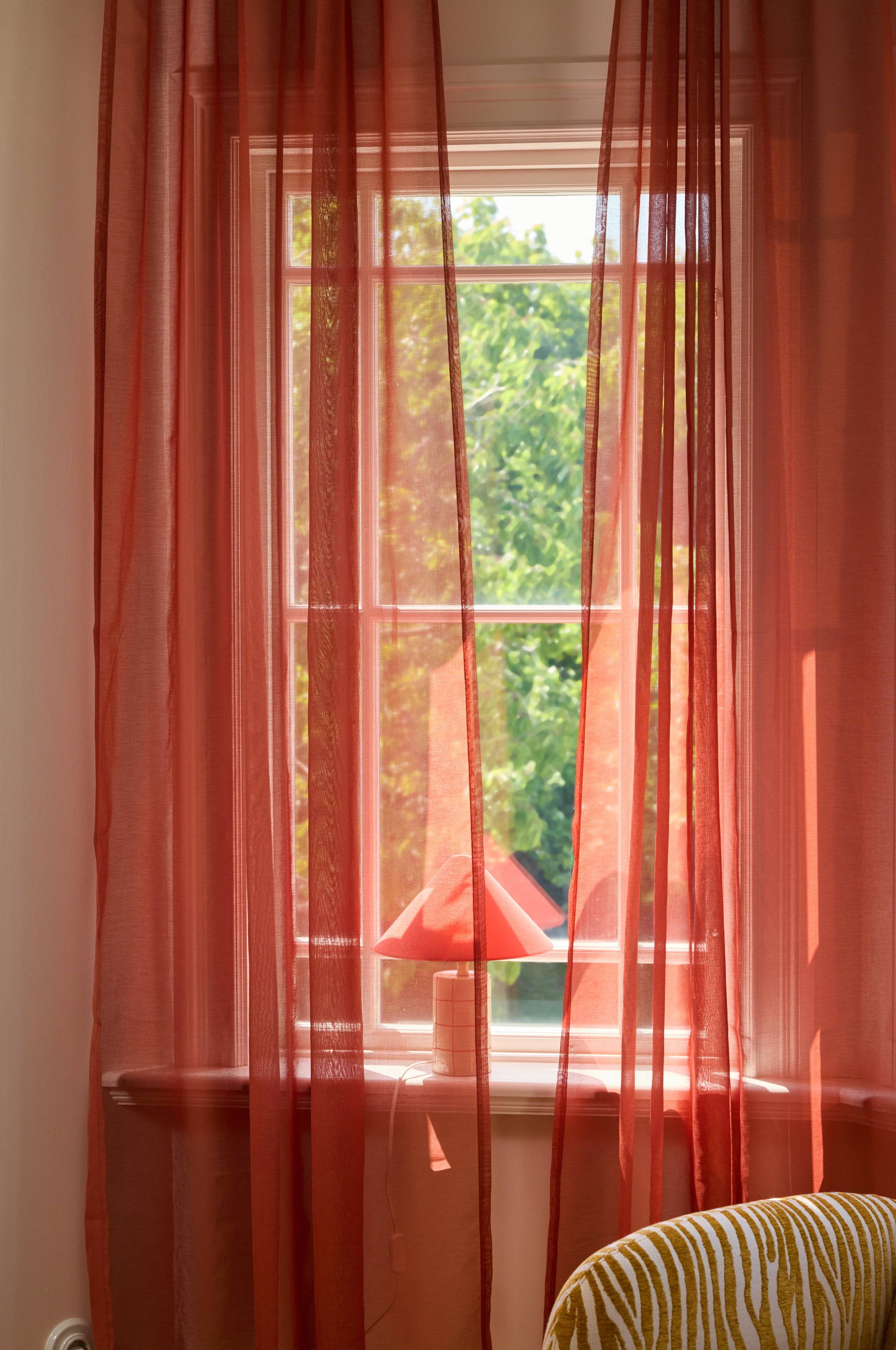 Zwei Vorhanglängen aus zartem und luftigem Voile-Polyester, der leicht fällt und viel Licht spendet. Wenn du die Vorhänge für das Fenster zuziehen willst, um etwas Privatsphäre zu haben, bekommst du trotzdem das schöne Licht. Wenn sie an der Seite des Fensters hängen, nehmen sie nicht so viel Platz ein, werden aber als ordentlicher empfunden. Das Material des Vorhangs ist recycelt.
