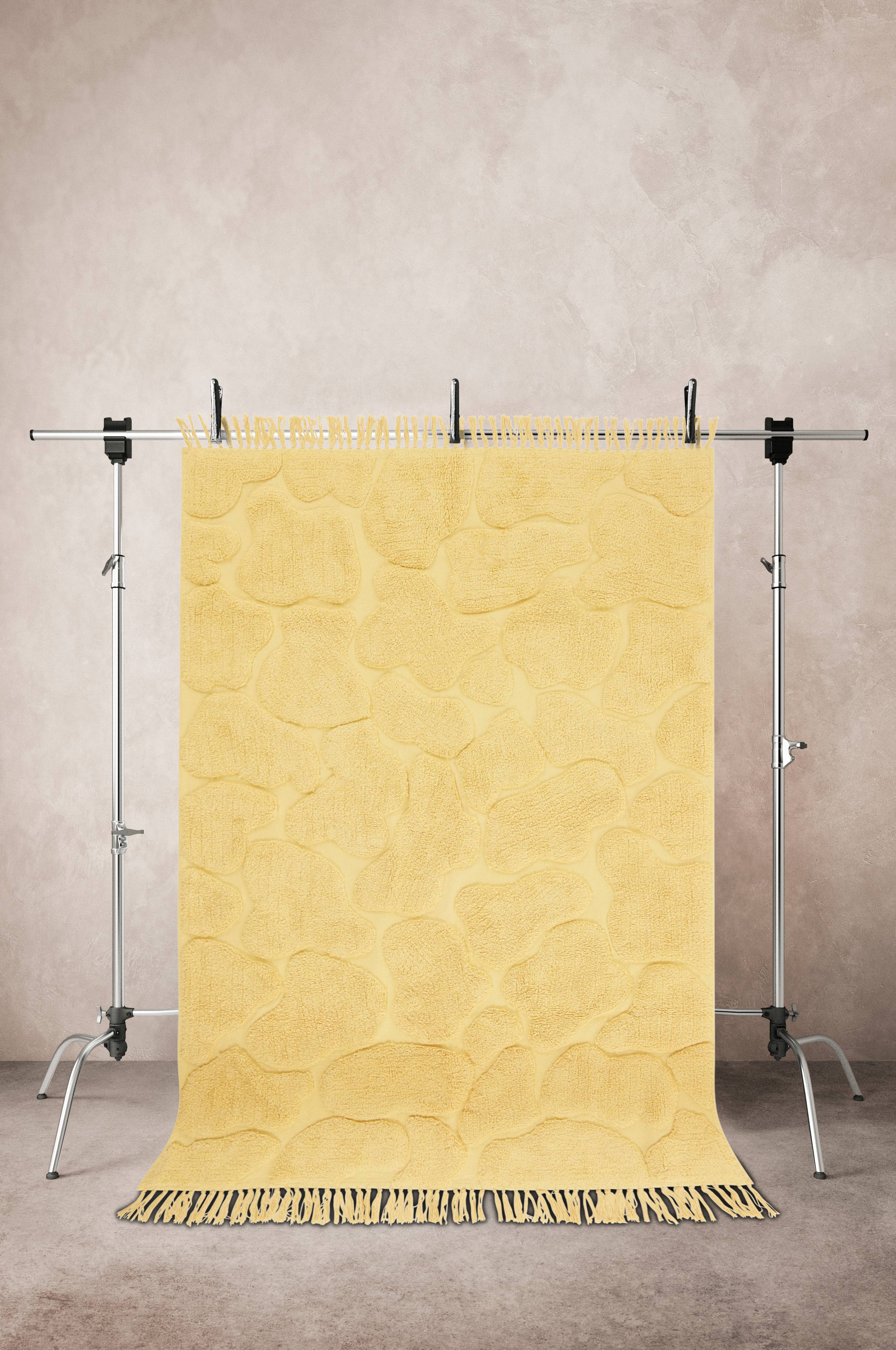 Webteppich aus Baumwolle mit getufteten Partien, die dem Flor ein raffiniertes Wellenmuster verleihen. Das Ton in Ton gehaltene Muster erinnert an große edle Raubkatzen. Mit schönen geknoteten Fransen an den Stirnseiten. Fransenlänge 8 cm. Florhöhe 1 cm. Dicke 1,1 cm. 1770 g/m².