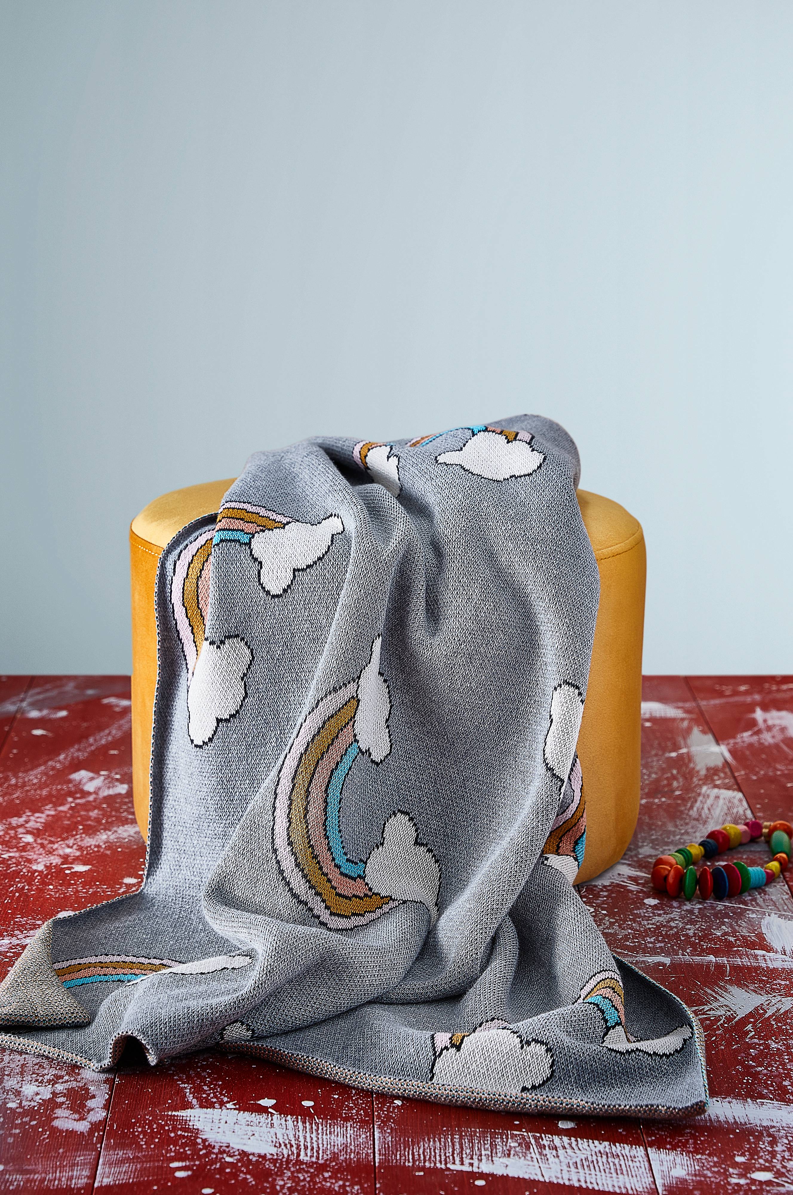 Vielseitig einsetzbare, kuschelige Babydecke aus Bio-Baumwolle. Die ALIVIA Babydecke hat ein niedliches Regenbogenmotiv und eignet sich als Kuschel- oder Schmusedecke.