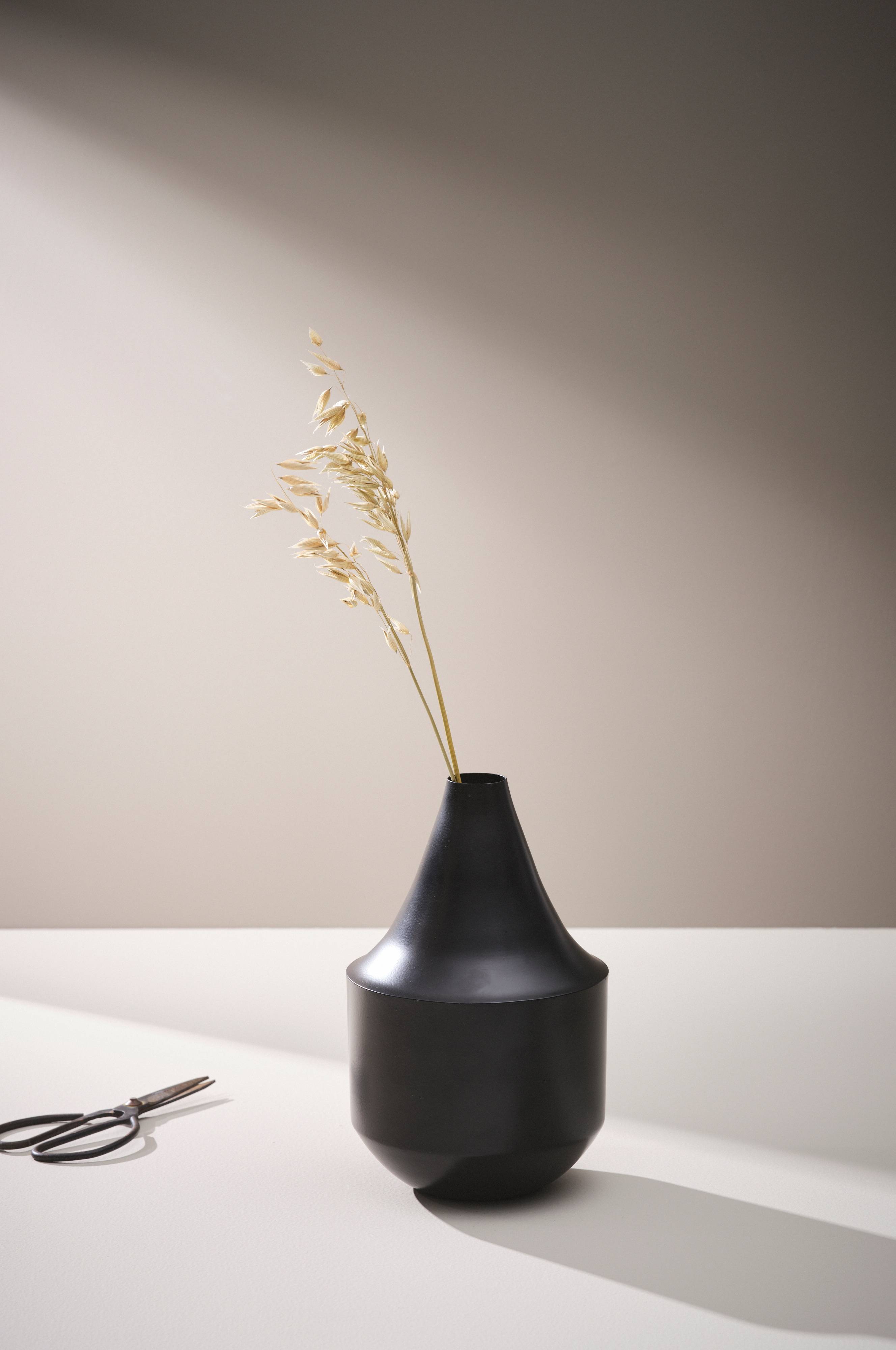 Vase aus Eisen. Die schöne Tropfenform ist zeitlos und stilvoll. Die Vase ist in einem matten Finish oder einer goldfarbenen Plattierung erhältlich.