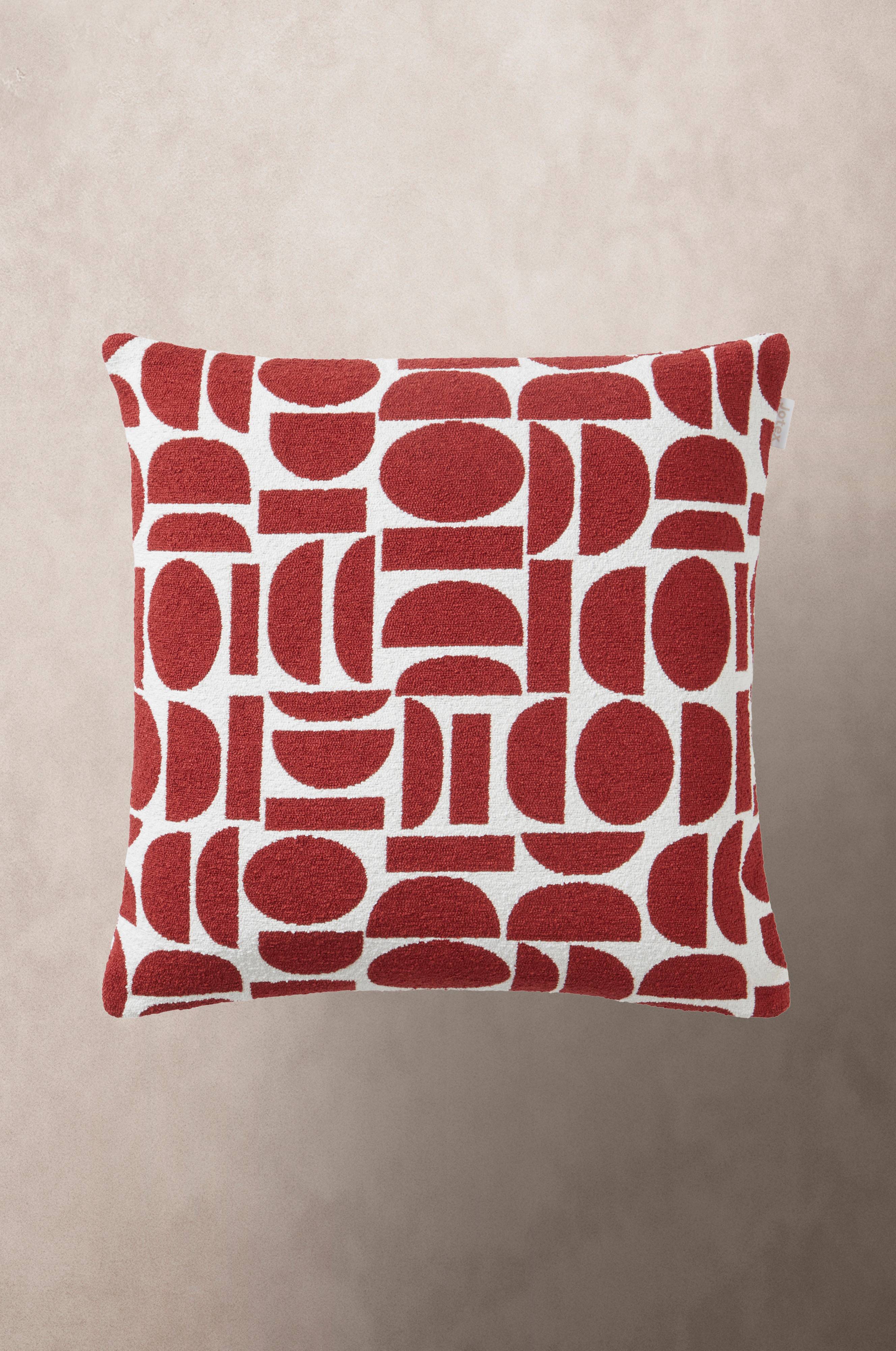 Kissenhülle mit Jacquardmuster. Die geometrischen Figuren bestehend aus farbigen Rechtecken und Kreisen auf weißem Grund passen ebenso zu einem modernen Zuhause wie zu einer Einrichtung im Retrostil. Der Stoff ist stabil und etwas grober. Auch die Rückseite ist gemustert. Reißverschluss unten. Grammgewicht des Stoffs 760 g/m².