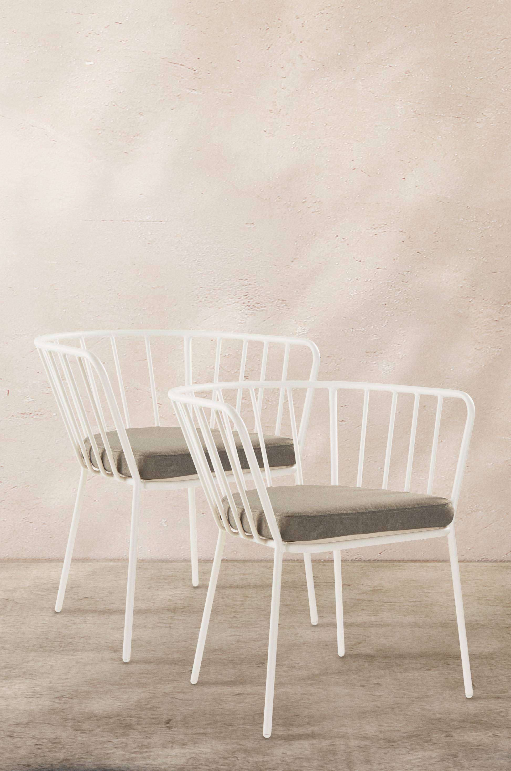 2er-Pack Armlehnenstühle aus pulverbeschichtetem, mattiertem Aluminium und einem Sitzpolster mit Stoffbezug. Das Draußensitzen ist einer der großen Genüsse in der warmen Jahreszeit und darf nicht kompliziert sein. ANTIBES heißen unsere formschönen, wetterfesten Armlehnenstühle, die man nicht rein- und raustragen muss.