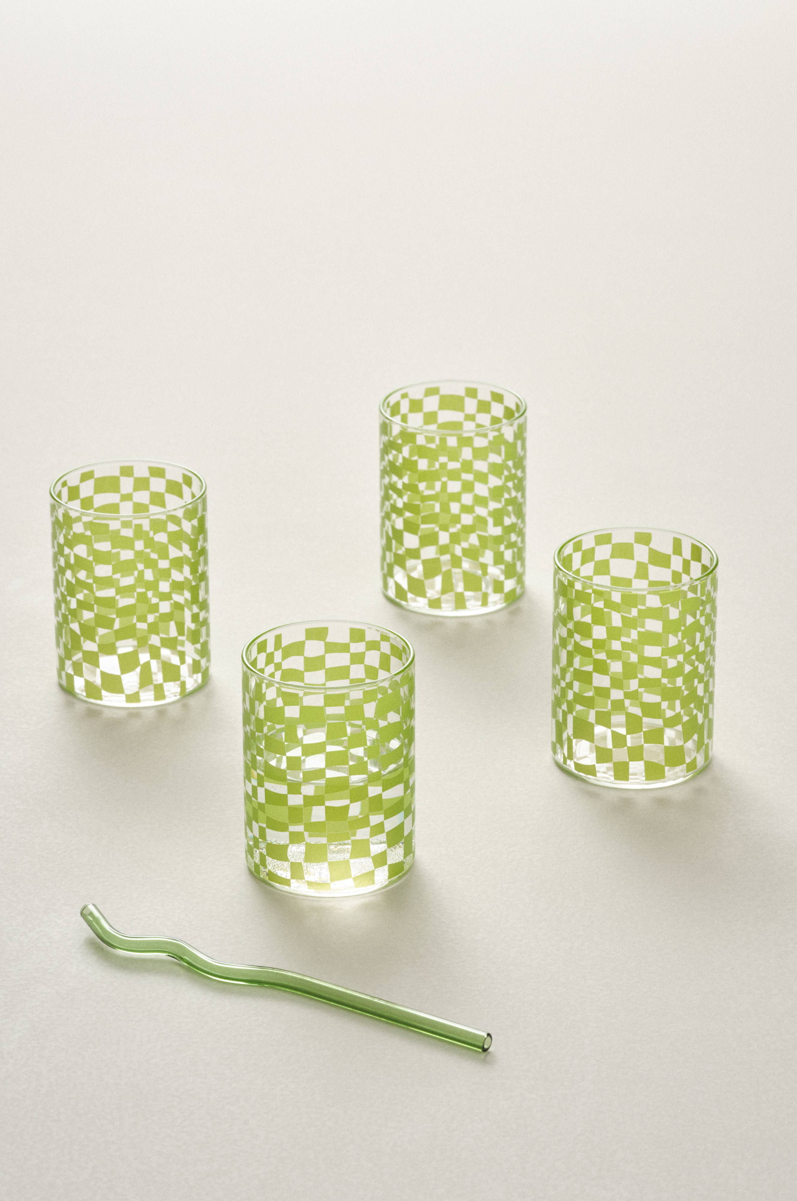 4 Gläser aus Klarglas mit aufgedrucktem, unregelmäßigem, grünem Rautenmuster, das den Gläsern einen naivistischen Look verleiht. Die geraden, gemusterten Gläser sorgen für einen sommerlichen, verspielten Farbtupfer und lassen alle Getränke, von Wasser bis Limonaden, appetitlich aussehen!
