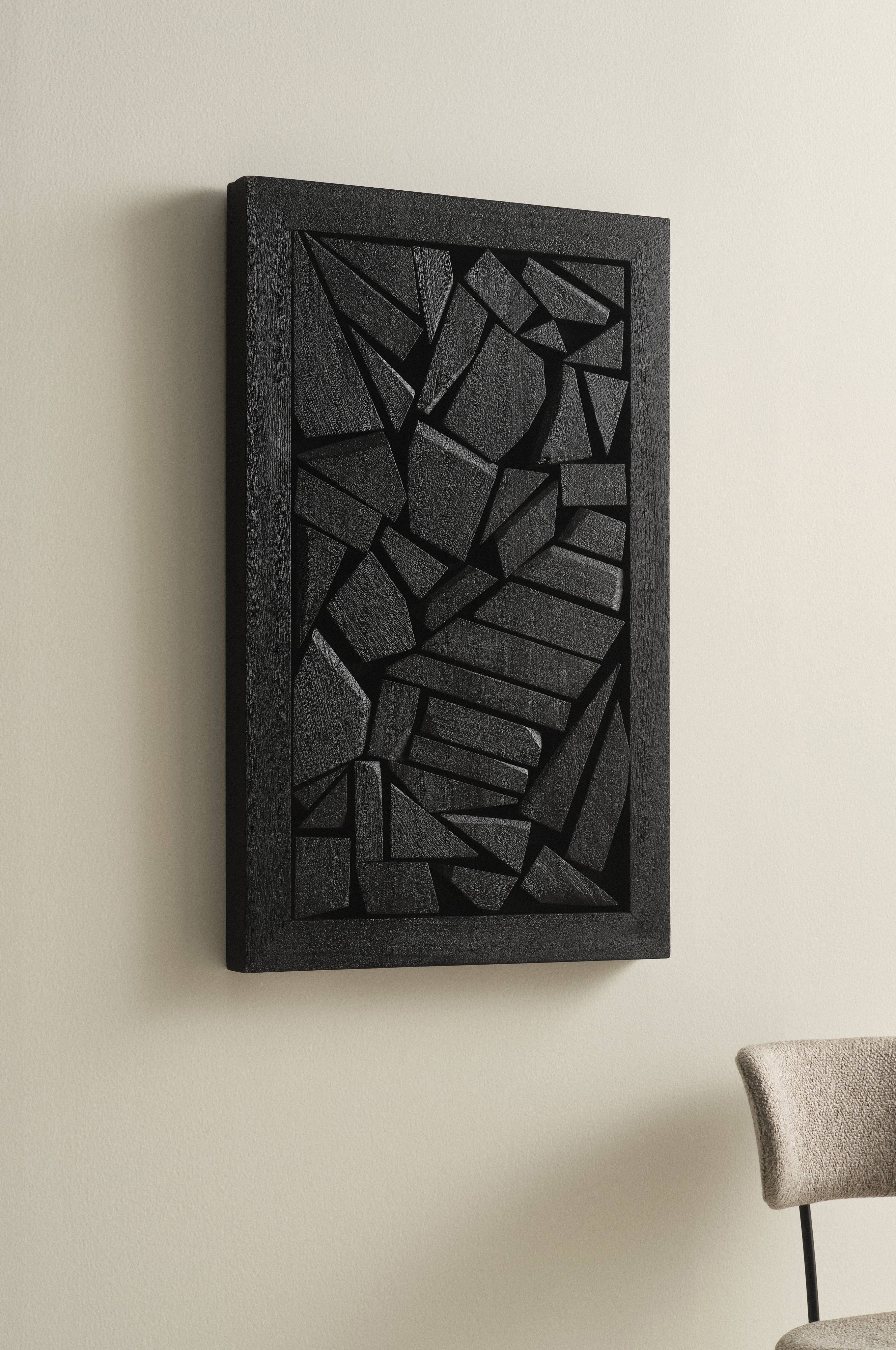 Große handgefertigte Wanddekoration aus massivem Mangoholz. Das Motiv zeigt ein geometrisches Puzzle mit 3D-Effekt, das sich aus gleichfarbigen Holzteilen zusammensetzt. Die Teile sind in den Rahmen eingelassen. Die sichtbare Maserung des Holzes verleiht dem Design eine zusätzliche Dimension. Durch die kernige Optik des Naturholzes mit all seinen Variationen und die wertige Handwerkskunst ist jedes Exemplar ein Unikat. Zwei Aufhängungen auf der Rückseite.