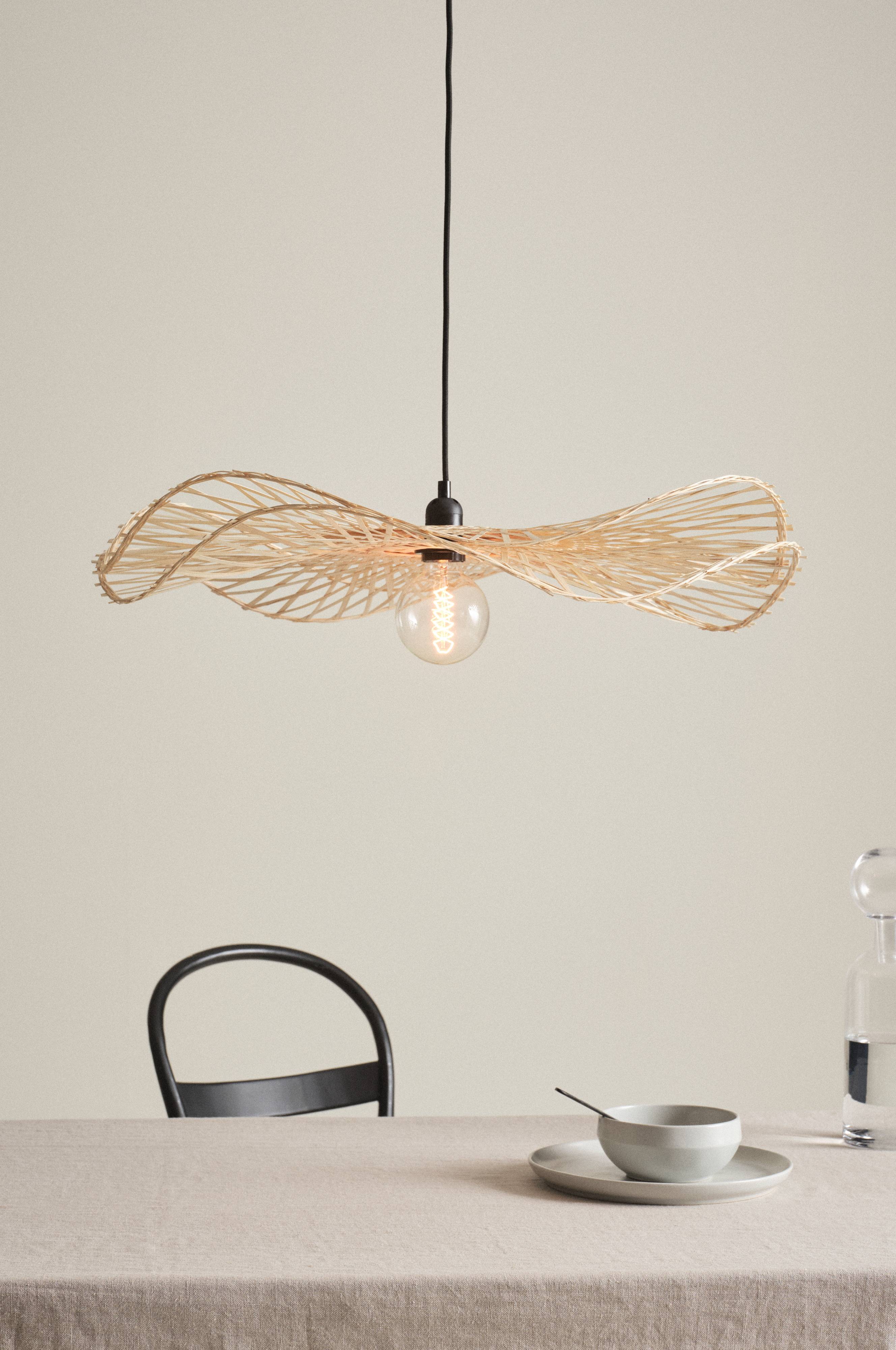 Deckenleuchte mit einem raffiniert geschwungenen Lampenschirm aus natürlichem Bambus. Halterung und Baldachin sind aus Kunststoff. Schwarzes Textilkabel. Ungeerdete Leuchte (Klasse 2). Aufgrund von EU-Vorschriften ist in bestimmten Ländern ein separater Deckenanschluss erforderlich. Der Deckenanschluss muss ungeerdet sein (Klasse 2) und ist separat erhältlich.
