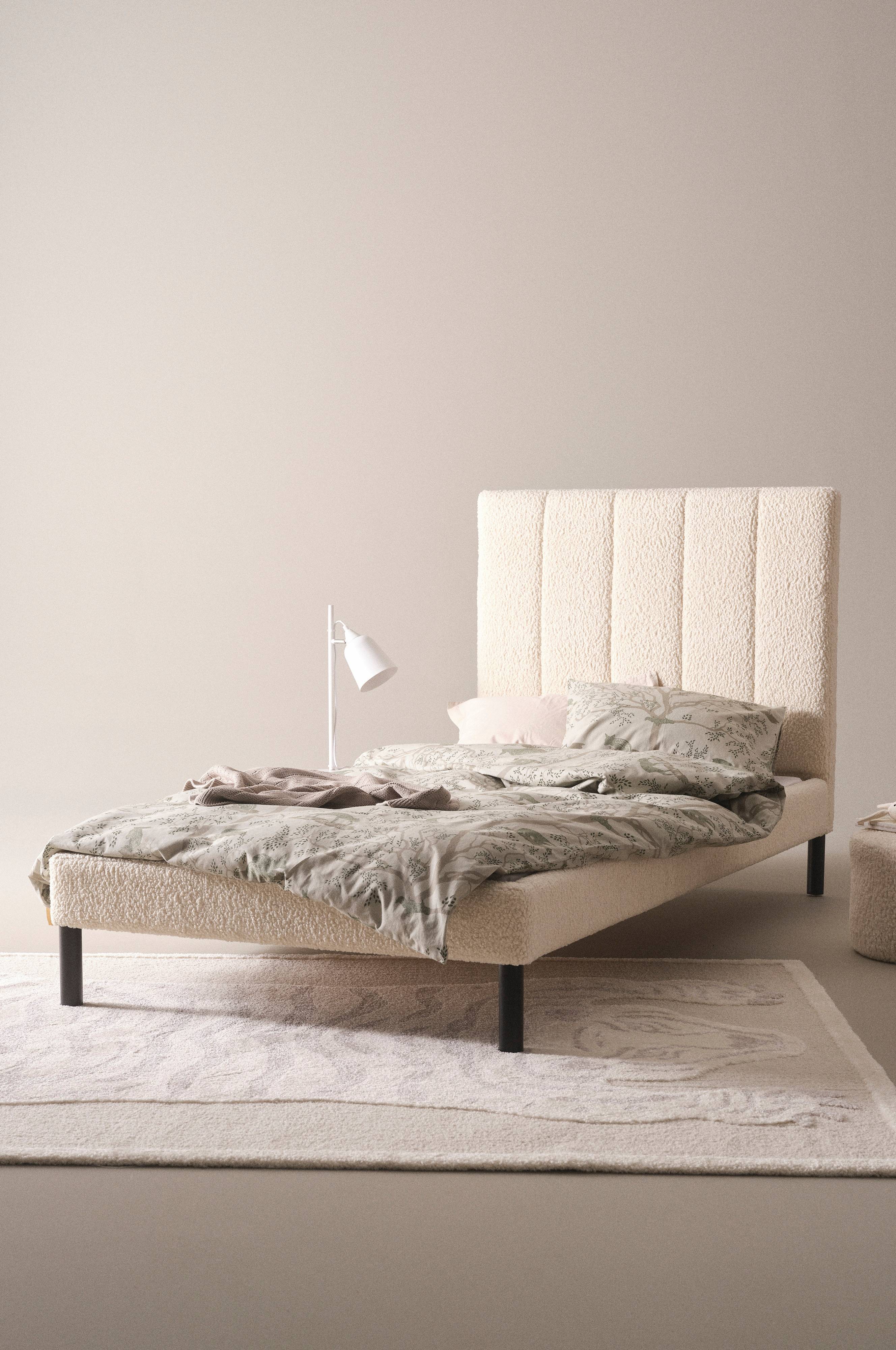 Kinderbett mit hohem bezogenen Kopfteil. Der Korpus ist aus FSC-zertifiziertem Kiefernholz gefertigt, der Lattenrost aus FSC-zertifiziertem Sperrholz und Polyamidgurten. Die geraden runden Beine sind aus lackierter Birke gearbeitet. Kopfteil und Rahmen sind gepolstert und mit Teddyfleece aus Polyester bezogen. Das Kopfteil zeigt sich mit einer Streifensteppung. Der strapazierfähige Teddyfleece hat eine Scheuerfestigkeit von 40.000 Martindale. AVELLINO ist zugleich elegant und behaglich. Wie herrlich, sich gemütlich zurückzulehnen und einem spannenden Märchen zu lauschen. Matratzengröße 90 x 200 cm. Matratze separat erhältlich.