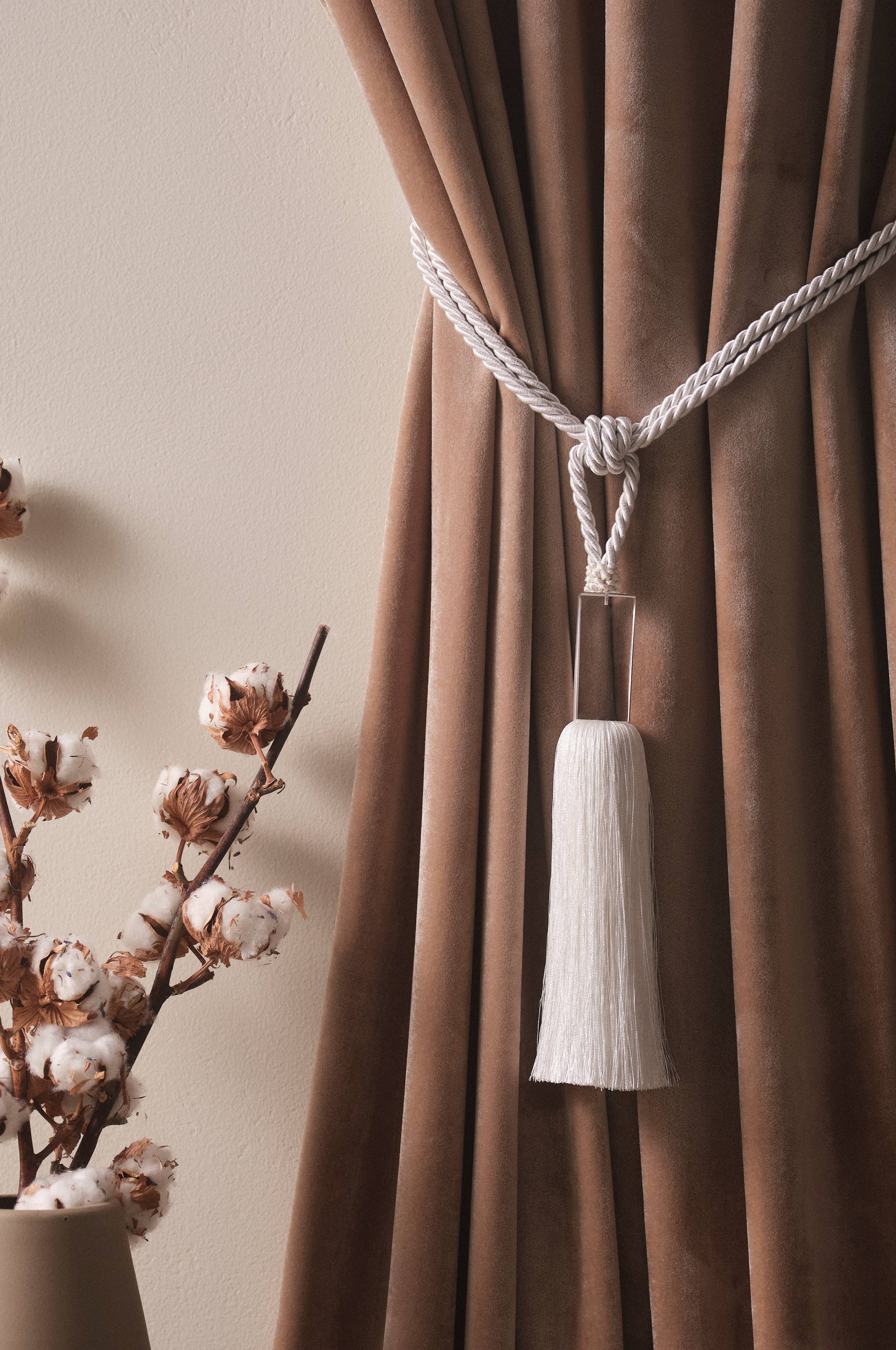 2er-Pack Raffhalter aus Polyester. Die BIBI Raffhalter bestehen jeweils aus einer kräftigen Quaste mit dekorativer Befestigung aus transparentem Acrylglas.
