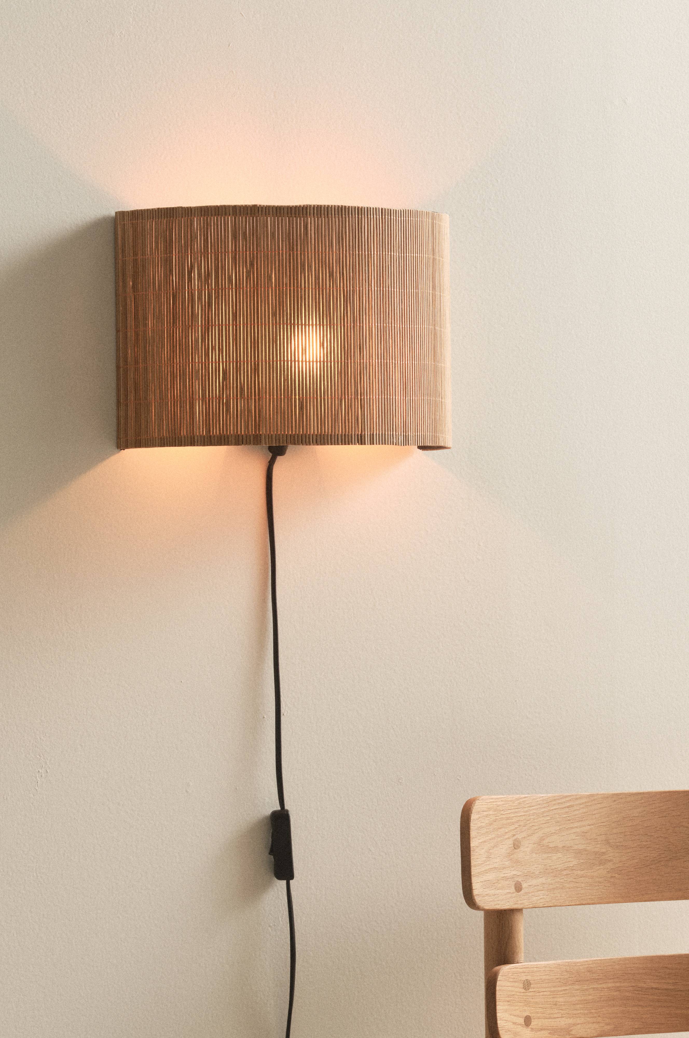 Betont schlichte Wandleuchte mit halbrund gearbeitetem Lampenschirm aus geradem Bambusgeflecht, das für eine softe Optik sorgt. Die Innenseite des Lampenschirms besteht aus satiniertem PVC, das das Licht schön reflektiert. Gestell aus pulverbeschichtetem Metall. Schwarzes Kabel mit Schalter.