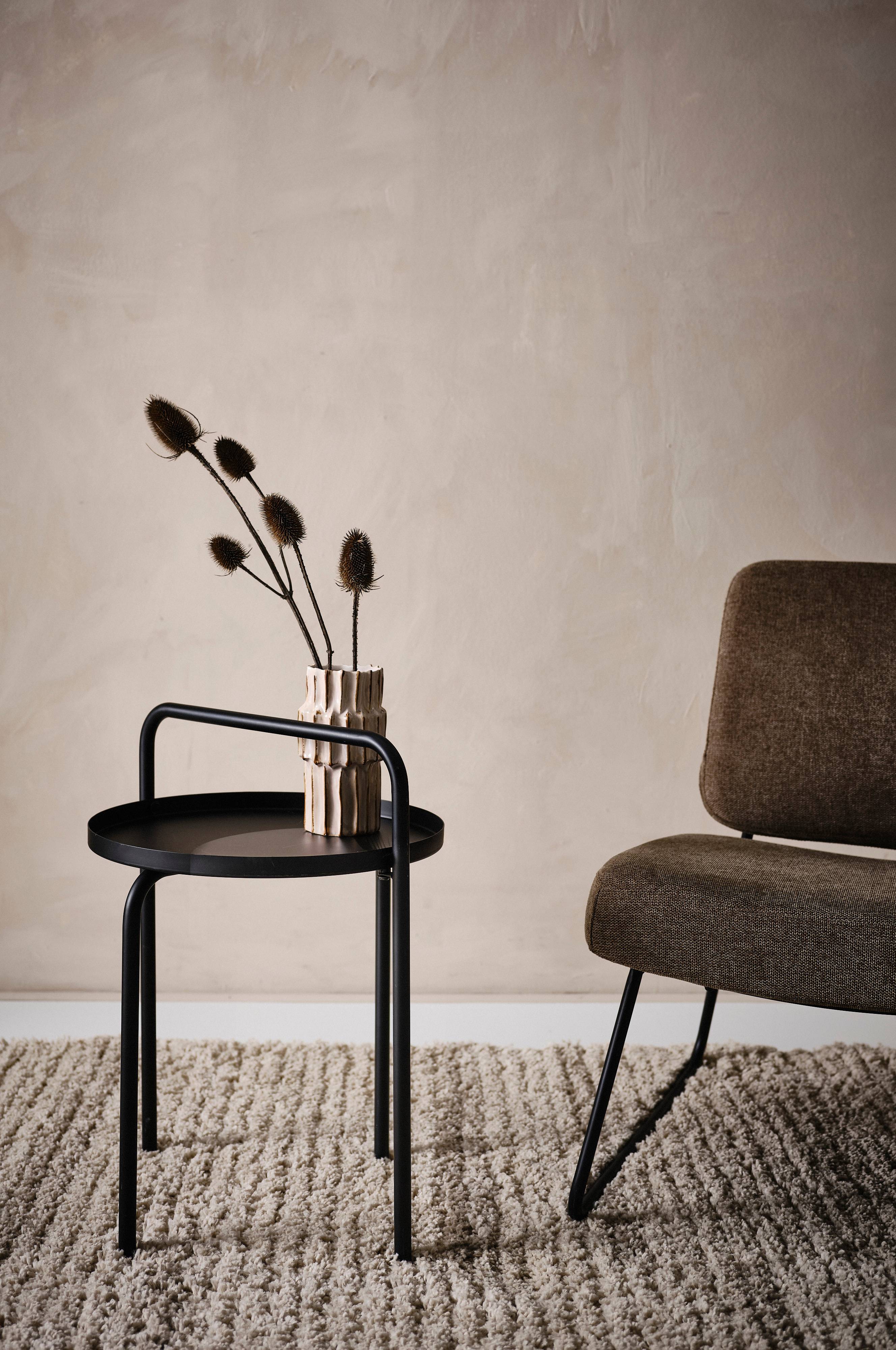 Runder Tisch aus pulverbeschichtetem Metall. Bei diesem hübschen Tisch ist der Griff der besondere Hingucker. Wenn du dein Buch oder das Tablet an den Griff lehnst, hast du die Hände frei zum Stricken oder Knabbern.