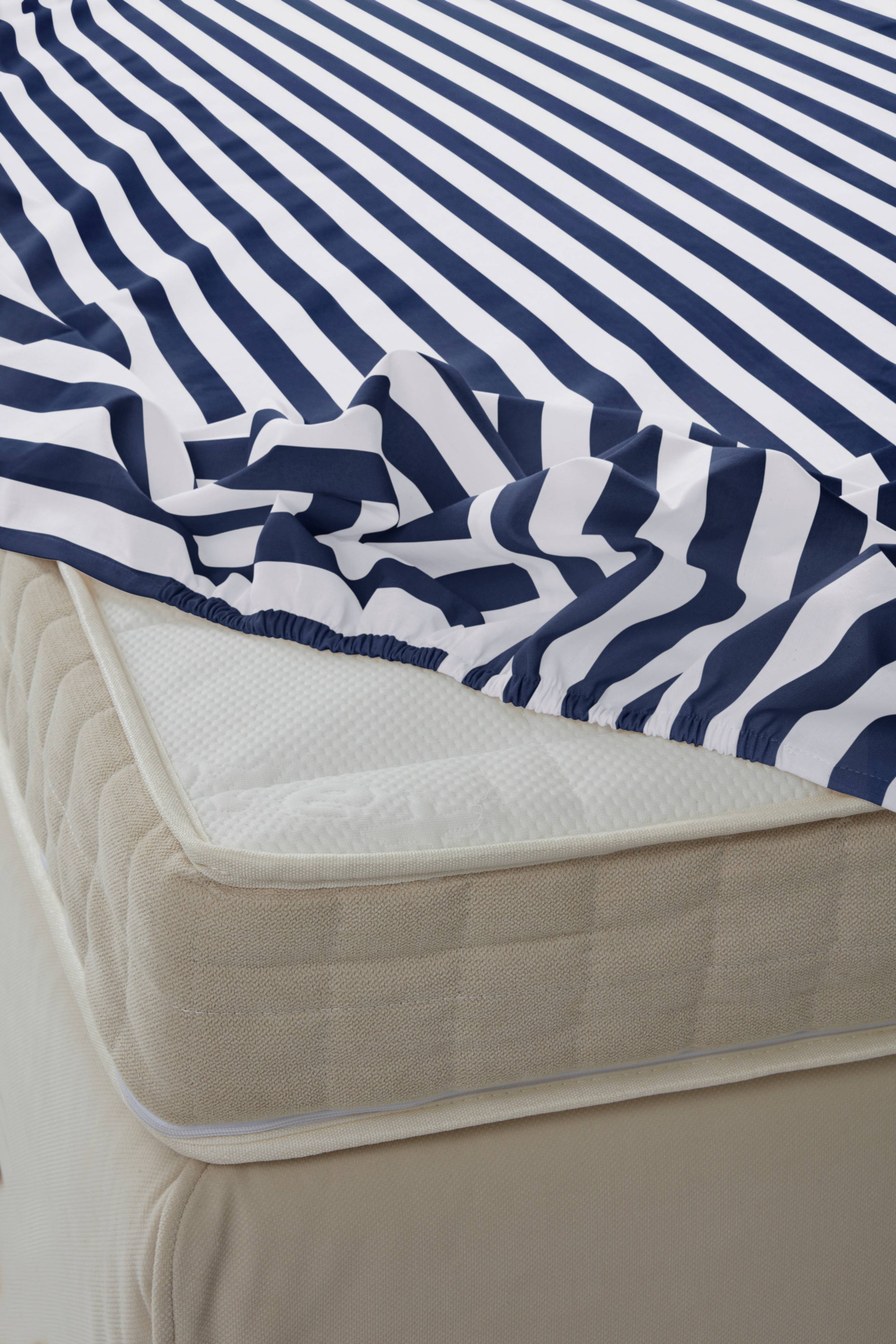 Gestreiftes Spannbettlaken aus Bio-Baumwolle. Durch die Gummizüge in den Ecken lässt sich das Laken leicht aufziehen und liegt schön glatt. Die kühle, hautfreundliche Baumwolle schmückt sich mit einem behaglichen Print. Bei dem dekorativen Streifenprint wechselt sich Weiß mit einer klaren, freundlichen Farbe ab. Hübsche Streifen sind ein Klassiker für Groß und Klein. Fadendichte 144 TC. (Mit der Fadendichte bzw. dem TC-Wert (Thread Count) wird die Anzahl der Fäden in Kette und Schuss pro Quadratzoll angegeben. Je höher die Fadendichte, desto höher die Qualität.)