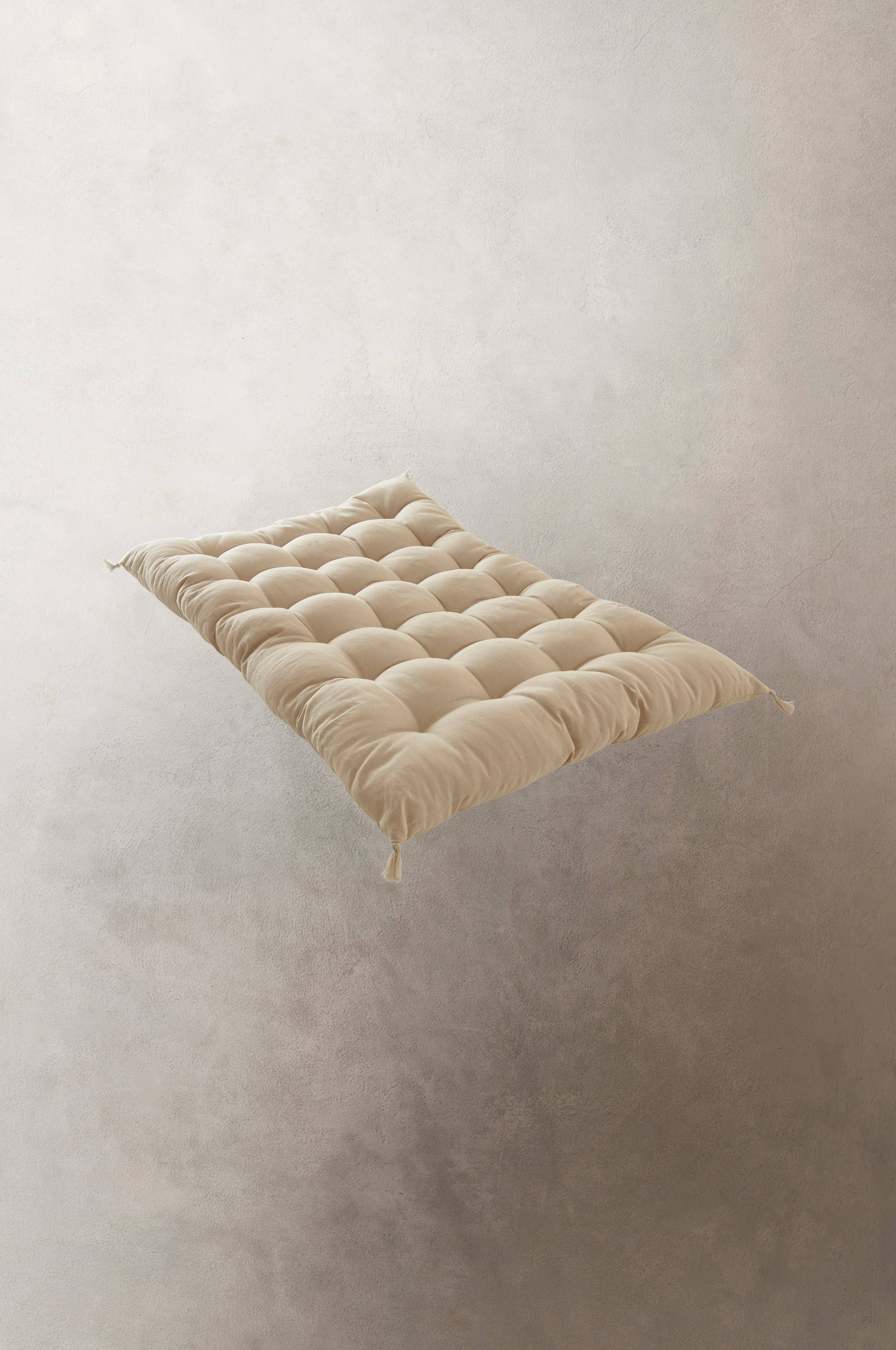 Sitzkissen aus Leinengemisch, mit weicher Polyesterfüllung. Das große einfarbige BOHO Kissen ist tief 16-fach geheftet und hat Troddeln an den Ecken. Ideal als Auflage für selbstgebaute Möbel aus Europaletten. Dank des besonderen Formats ist das Modell vielseitig verwendbar - nur deine Fantasie setzt Grenzen.