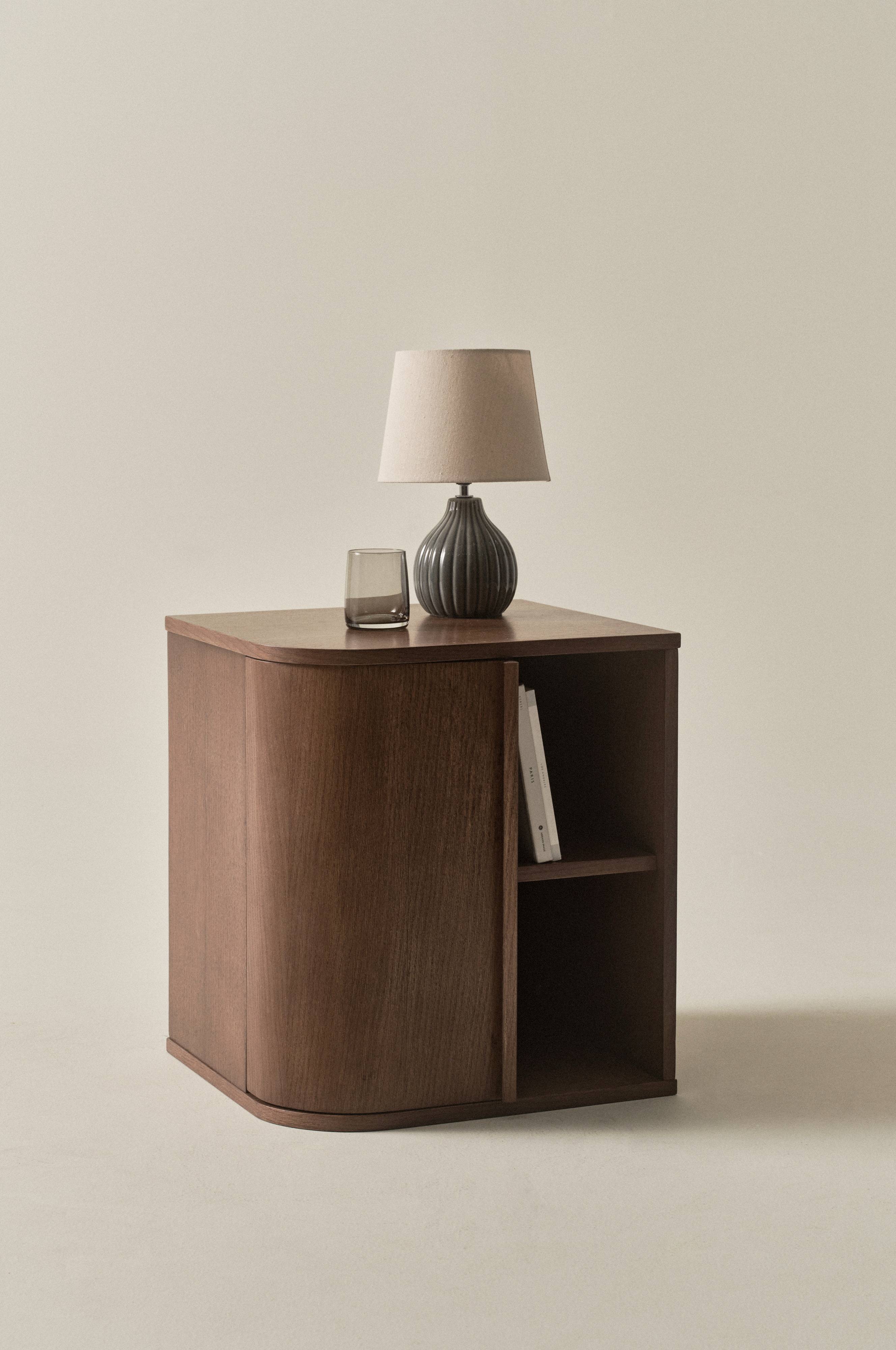 Nachttisch aus MDF mit Eichenfurnier im Sichtbereich. BRAUX ist ein schöner Nachttisch, der Luxus und Eleganz ausstrahlt. Die weichen, abgerundeten Ecken an der Vorderseite unterstreichen die elegante Optik. Der Nachttisch BRAUX besitzt eine tiefe, abgerundete Tür. Diese öffnet einen Aufbewahrungsbereich, der den halben Schrank umfasst. Die andere Hälfte besteht aus zwei offenen Regalfächern, in der du Dinge verstauen kannst, die du schnell griffbereit haben willst. Auch hinter der Tür befindet sich ein fester Regalboden, d. h. das Möbelstück bietet insgesamt vier Fächer. Der Nachttisch wurde mit wasserbasiertem Lack behandelt. Einige Montageschritte sind erforderlich. Inklusive Montageanleitung.