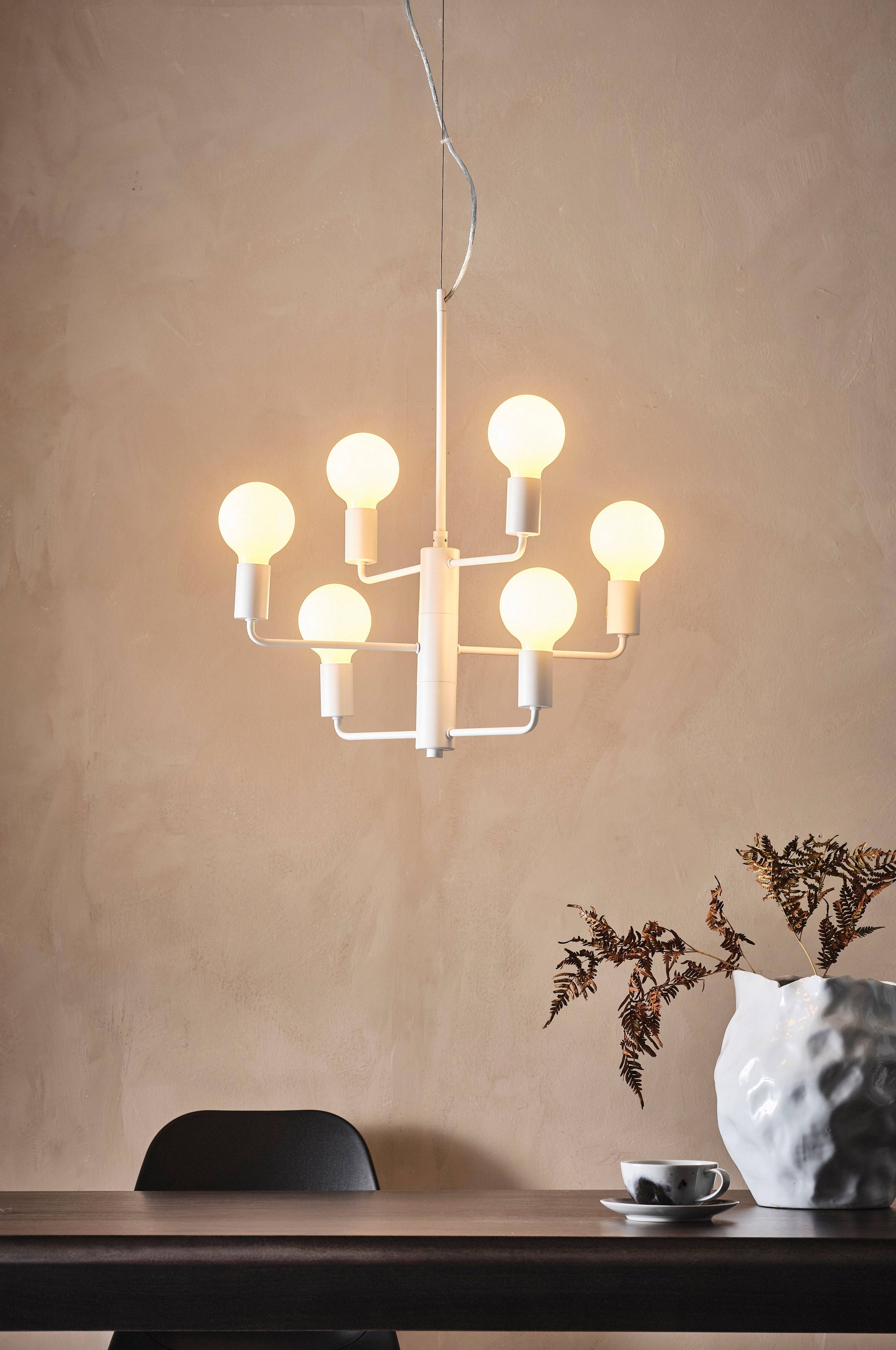 Pendelleuchte aus Metall, mit 6 Lichtpunkten und Aufhängeseil. Diese moderne Pendelleuchte besticht durch die schlichte, minimalistische Optik. Über die Lichtpunkte ihrer sechs Arme sorgt sie im Raum für angenehme Helligkeit. Kabellänge 70 cm. Ohne Leuchtmittel. Aufgrund neuer EU-Vorschriften ist kein Deckenanschluss enthalten. Der passende Deckenanschluss ROOF EARTH ist separat erhältlich.