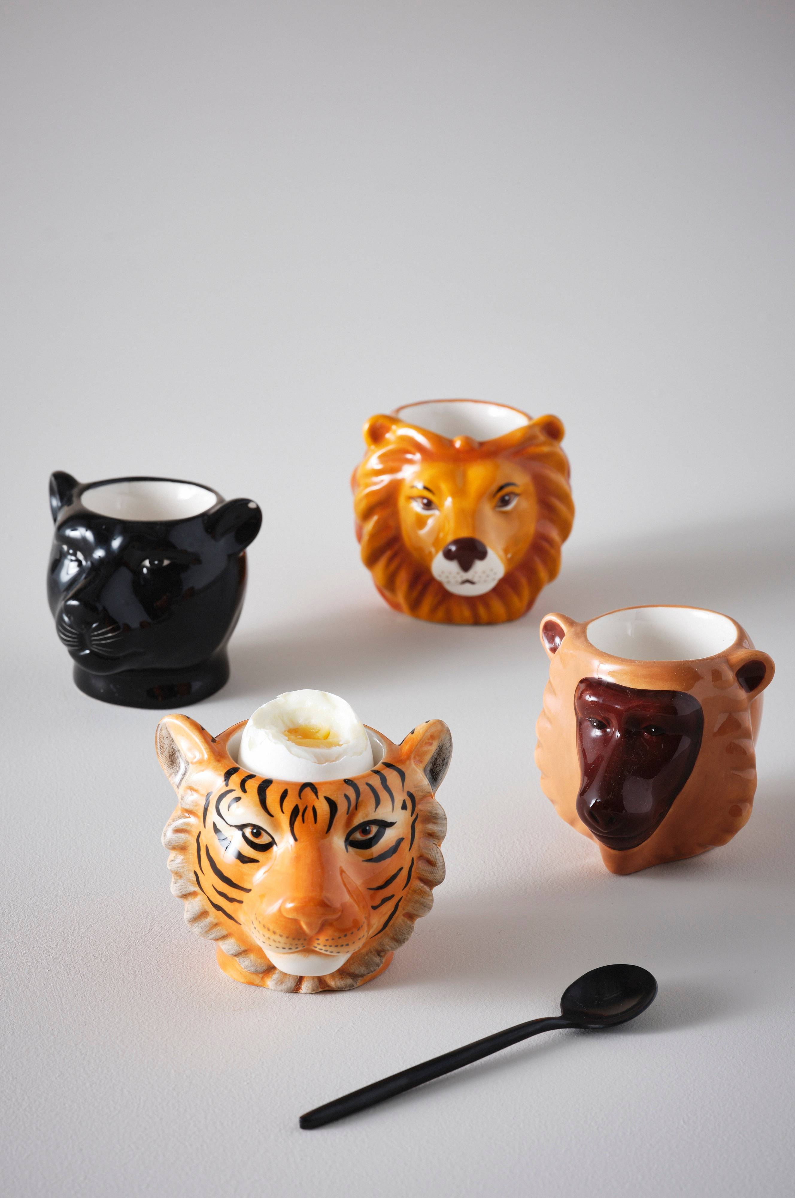 4er-Pack Eierbecher aus Dolomit-Porzellan Eierbecher in verspieltem Design mit Tiermotiven: einem Löwen, einem Tiger, einem Bären und einem Panther.