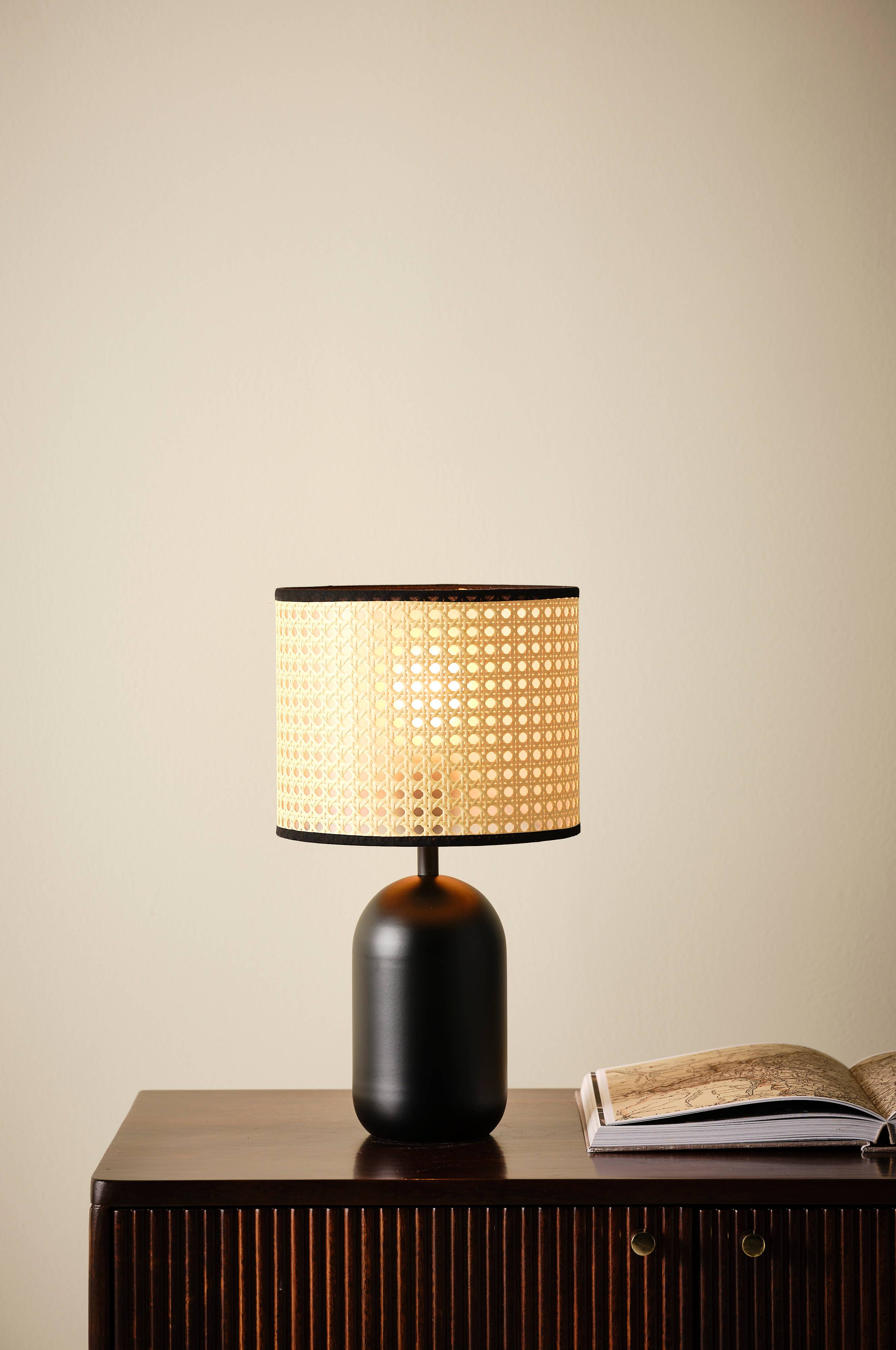 Tischlampe mit einem Schirm aus Rattanimitat in minimalistischem Stil und ruhiger Farbskala. Die schwarze Einfassung am Schirm sorgt für interessante Materialkontraste. Schwarzer Lampenfuß aus Metall