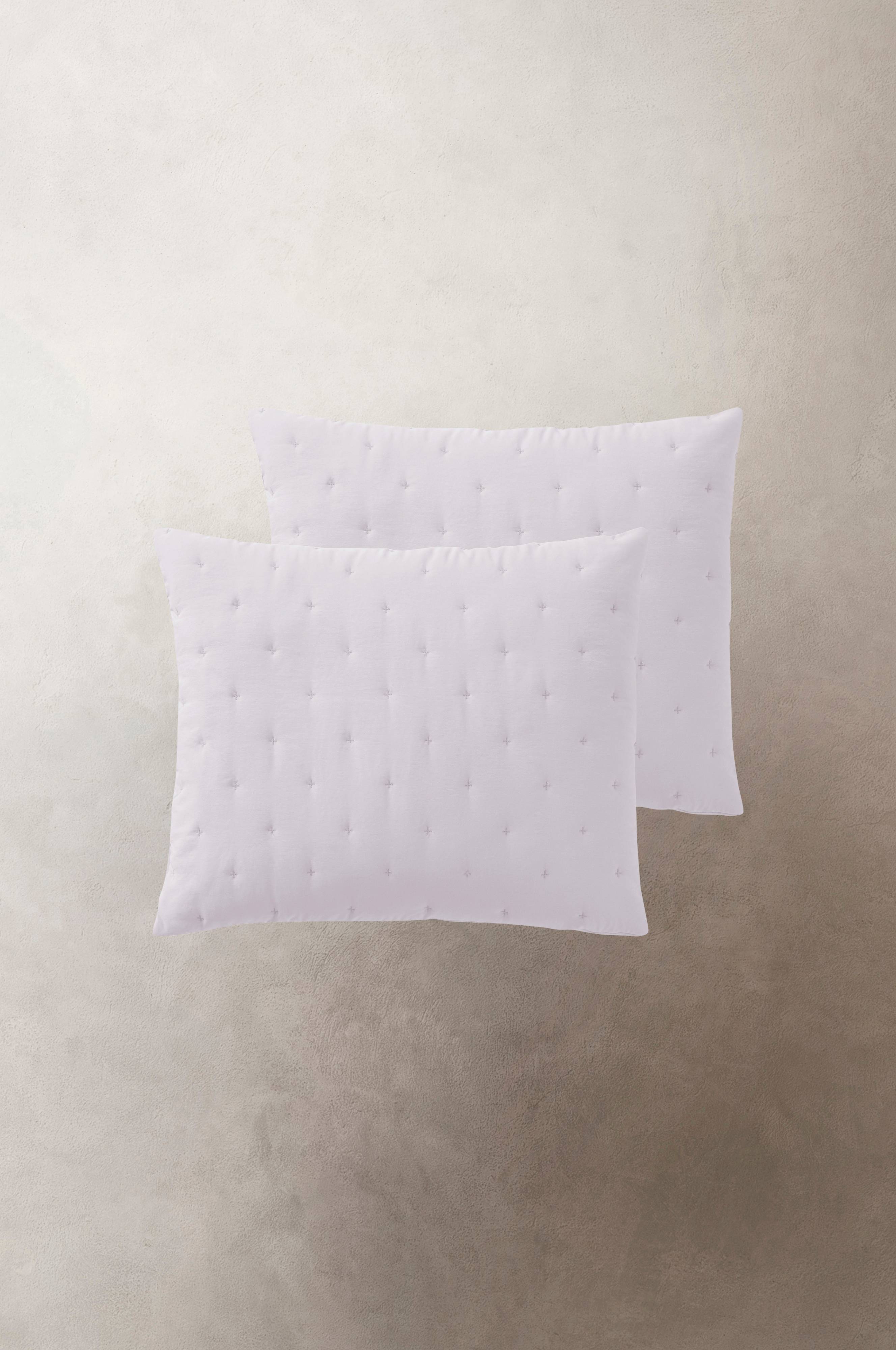 Zwei Kissenhüllen aus besonders weichem, da vorgewaschenem Polyester. Die Kissenhüllen haben auf der Oberseite ein einfaches Quiltmuster in Form von kleinen aufgestickten Kreuzen. Der Stoff hat eine leichte Wattierung, die durch das Quiltmuster fixiert wird. Die Rückseite ist glatt. Verdeckter Reißverschluss auf der Rückseite.