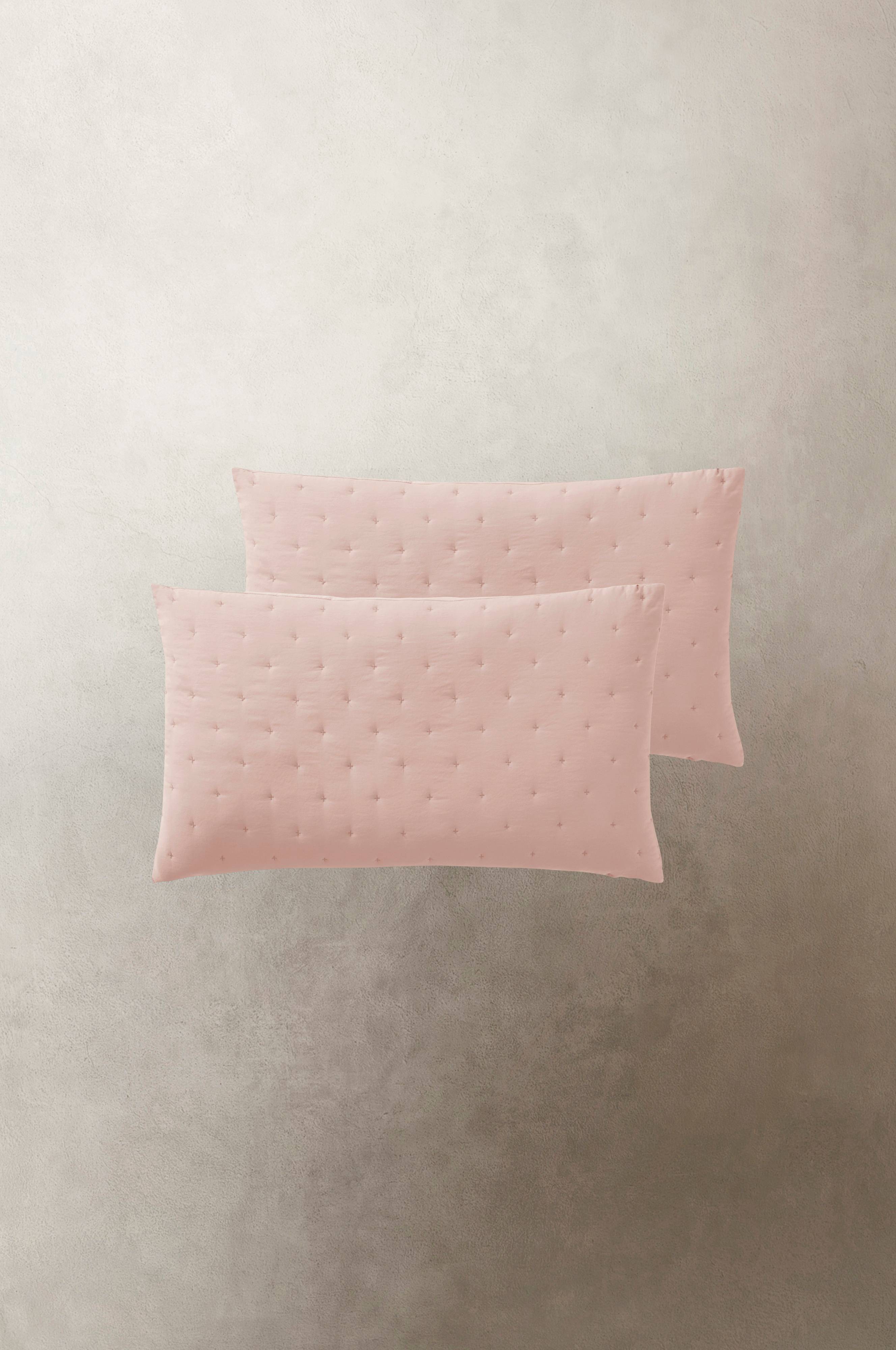 Zwei Kissenhüllen aus besonders weichem, da vorgewaschenem Polyester. Die Kissenhüllen haben auf der Oberseite ein einfaches Quiltmuster in Form von kleinen aufgestickten Kreuzen. Der Stoff hat eine leichte Wattierung, die durch das Quiltmuster fixiert wird. Die Rückseite ist glatt. Verdeckter Reißverschluss auf der Rückseite.