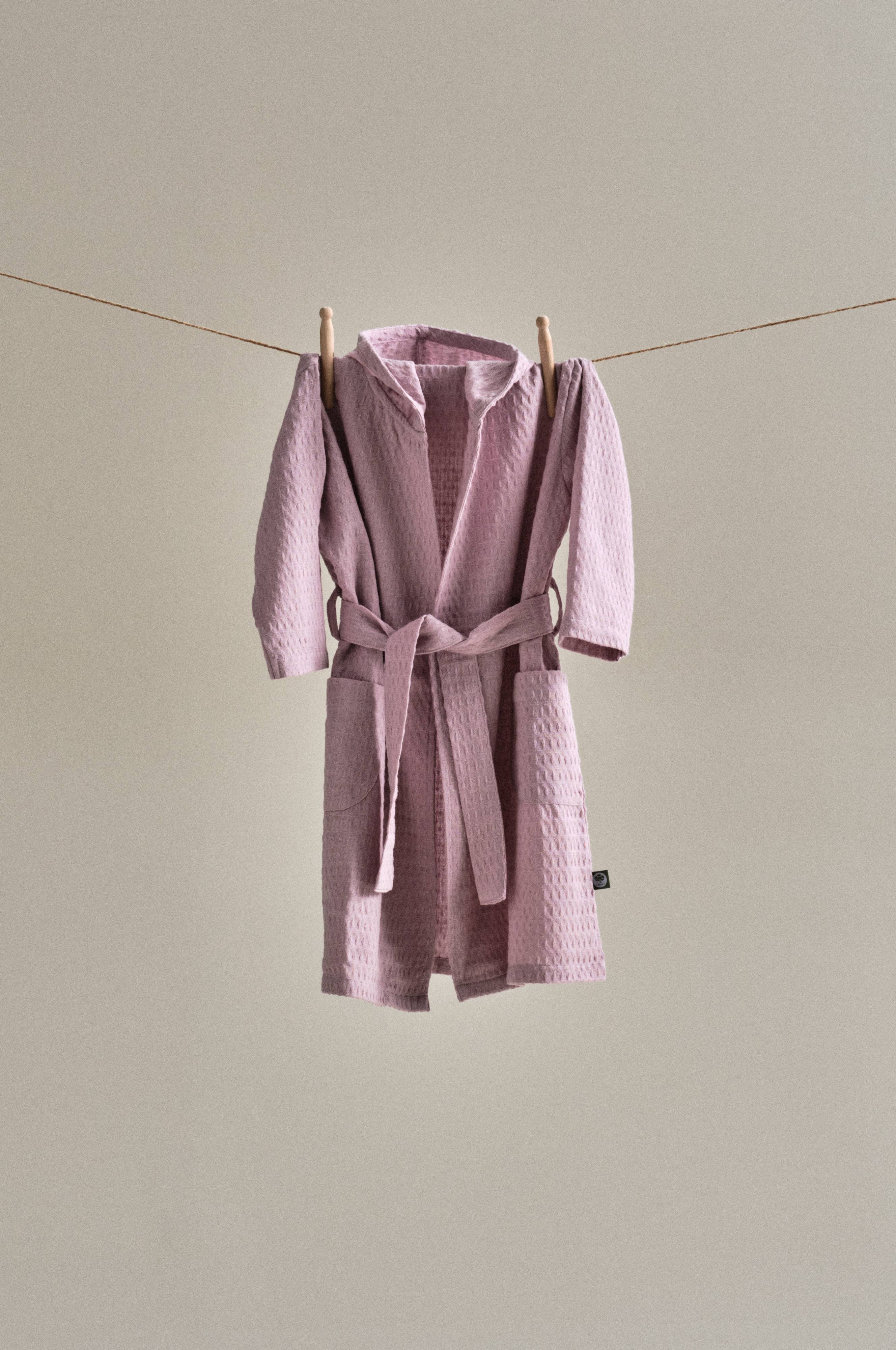 Bademantel aus Bio-Baumwolle, in einer weichen Waffelqualität. Der gemütliche Bademantel hat eine Kapuze, zwei Taschen und einen Bindegürtel in der Taille. Das vorgewaschene Modell besticht durch die besonders weiche Haptik der Waffelstruktur.