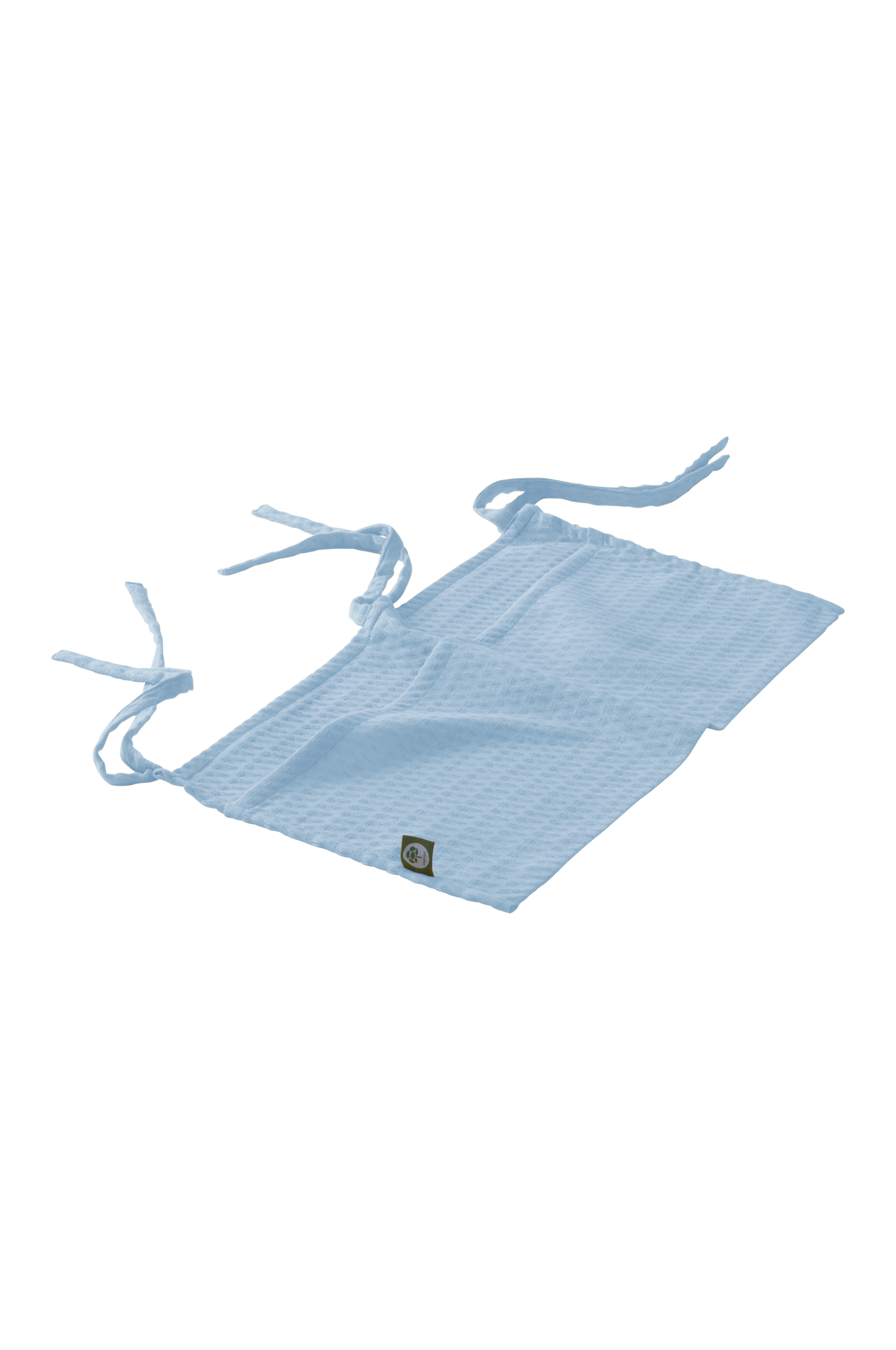 Aufbewahrungstasche aus Bio-Baumwolle, in einer weichen Waffelqualität. Die Aufbewahrungstasche wird per Bindeband befestigt, zum Beispiel oben am Babybett. Das vorgewaschene Modell besticht durch die besonders weiche Haptik der Waffelstruktur. Grammgewicht 230 g/m².