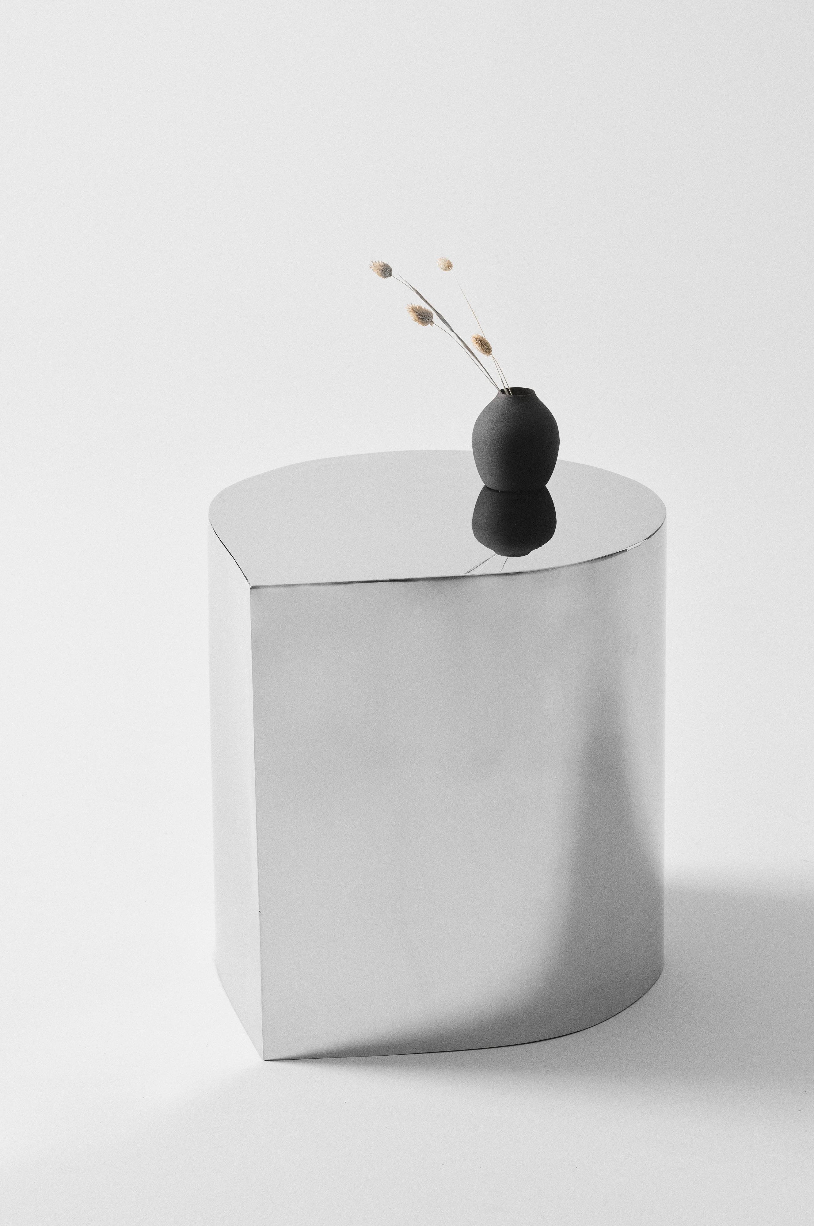 Ein tropfenförmiger Beistelltisch aus Edelstahl mit hochblankem Finish. Dieses Modell hat eine ganz ausgefallene Form und durch die 90-Grad-Spitze des Tropfens entsteht ein schönes Kleeblatt , wenn man vier Tische zusammen stellt. Der Beistelltisch macht sich auch gut in einer Ecke des Raums oder zwischen zwei in L-Form gestellten Sofas. Der Tisch ist nicht massiv und daher leicht zu hantieren. CUBE ist ein edler kleiner Tisch in einer außergewöhnlichen Form und einer tollen Metallic-Oberfläche, der dem Raum Luxus und Eleganz verleiht.