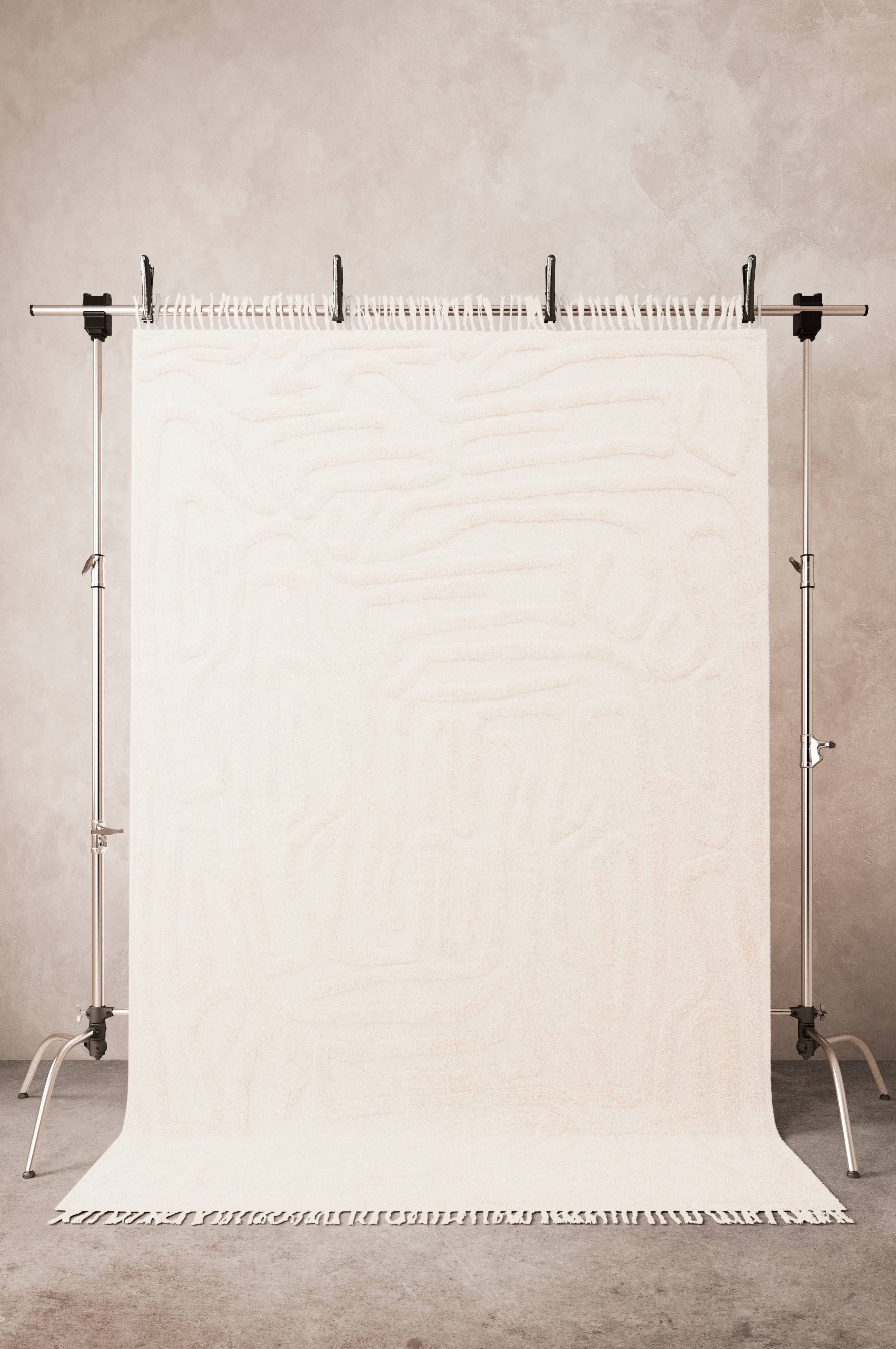 Einfarbiger Baumwollteppich mit Fransen. CORBIE schmückt sich mit einem unregelmäßigen, Ton in Ton gehaltenen Reliefmuster. Getuftete Partien auf gewebtem Untergrund sorgen hier für den besonderen Effekt. Fransenlänge 9 cm. Dicke 1 cm. 1400 g/m².