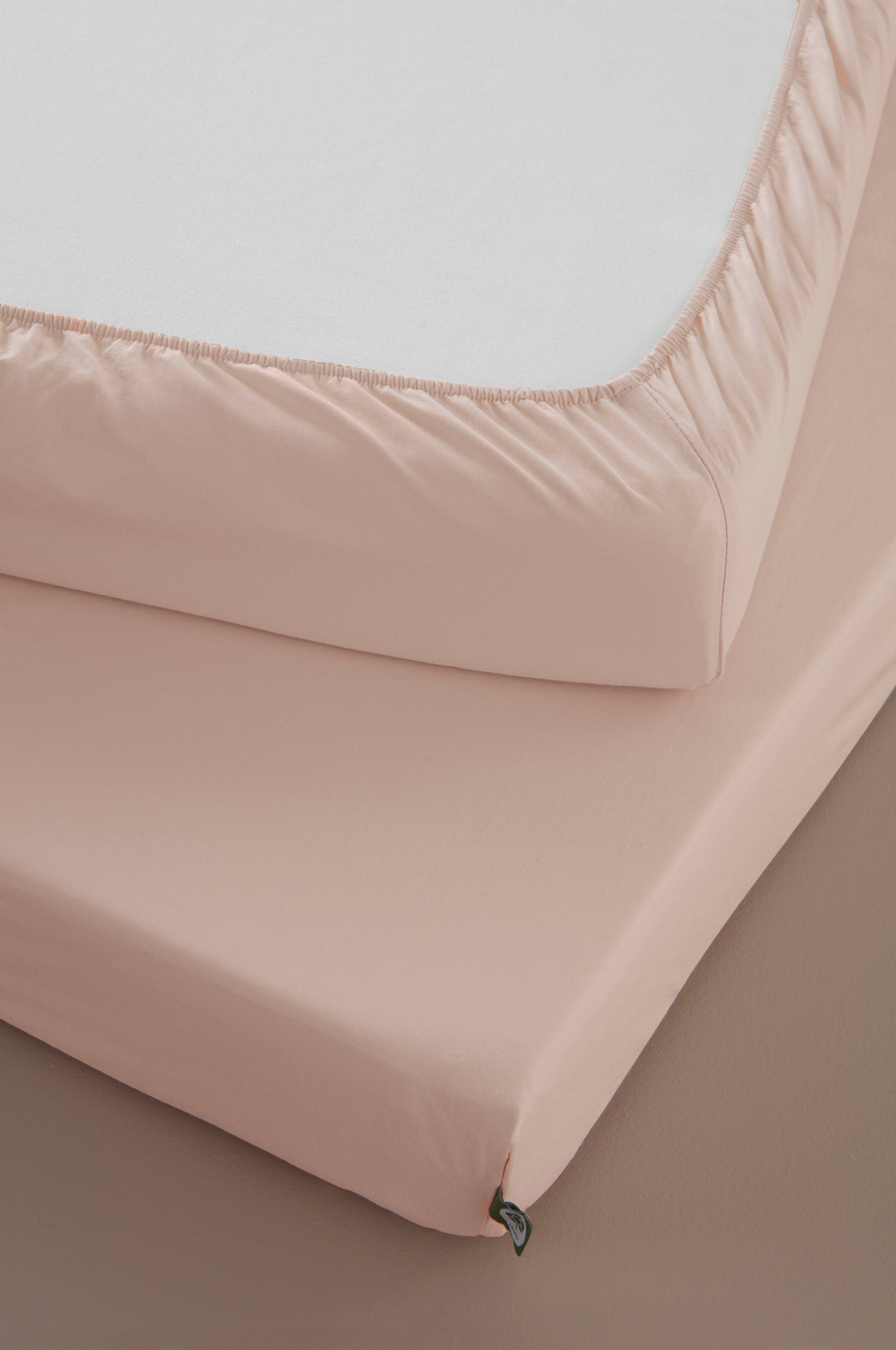 Stückgewaschenes Spannbettlaken aus Bio-Baumwollperkal. Perkal ist ein besonders weiches Gewebe aus feinem Baumwollgarn. Das Spannbettlaken wurde stückgewaschen, d. h. die Wäsche erfolgte nach dem Nähen. Durch die Gummizüge in den Ecken lässt sich das Laken leicht aufziehen und liegt schön glatt. Fadendichte 200 TC. (Mit der Fadendichte bzw. dem TC-Wert (Thread Count) wird die Anzahl der Fäden in Kette und Schuss pro Quadratzoll angegeben. Je höher die Fadendichte, desto höher die Qualität.)