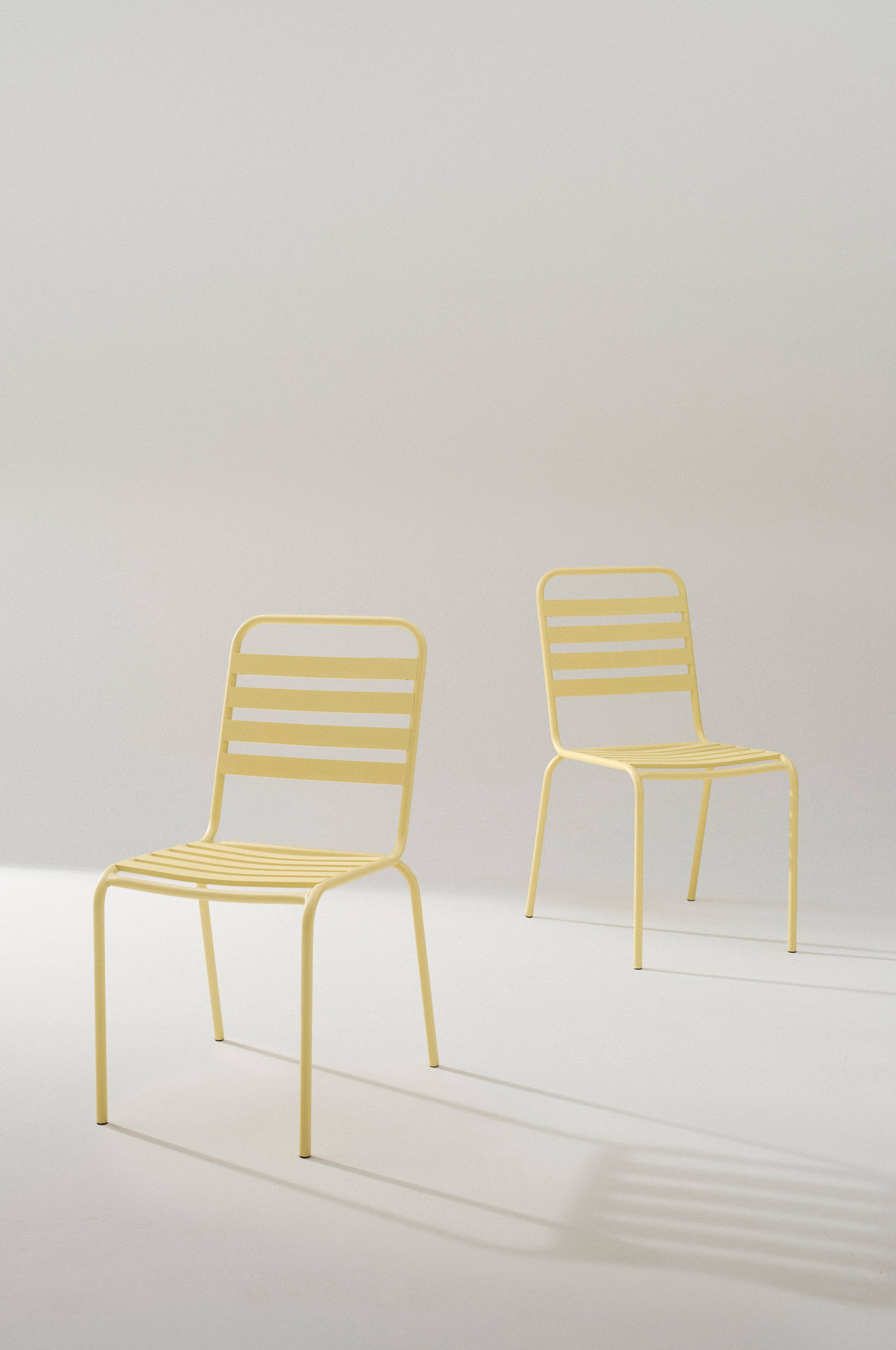 2 Stühle aus pulverbeschichtetem Aluminium. Das überaus praktische Modell ist so zierlich, dass es auch auf den Balkon passt. Da DEIA aus Aluminium gefertigt ist, können die Stühle problemlos draußen bleiben. Sie rosten nicht und lassen sich leicht abwischen. Diese Stühle sind stapelbar.
