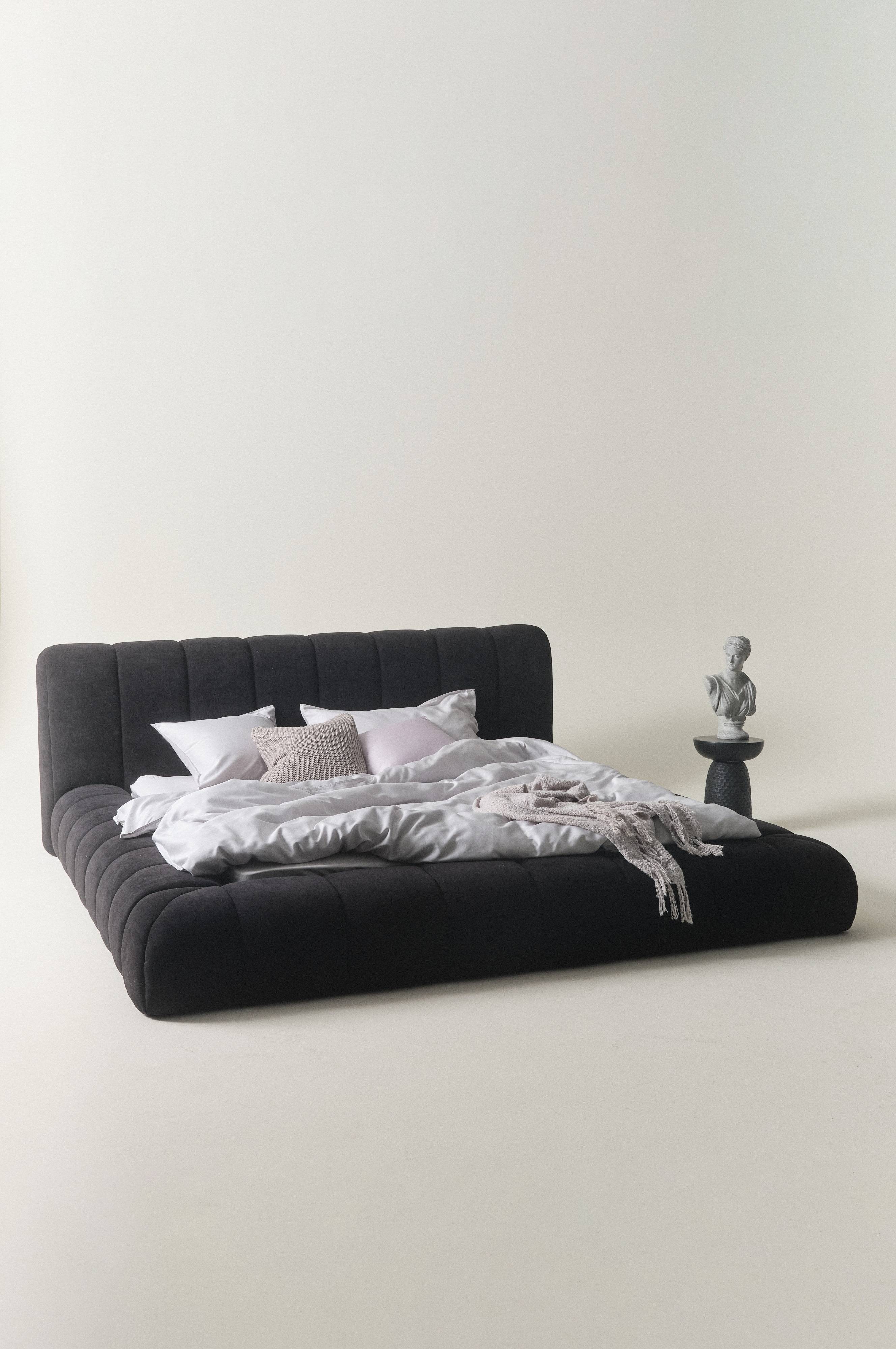 Das großzügige Bettgestell wirkt dank der soften, runden Formgebung besonders einladend. Kopfteil und Rahmen sind weich gepolstert und mit einfarbigem Stoff bezogen, der mit senkrechten Nähten dekorativ abgesteppt ist. Durch den neutralen Farbton der Polyesterqualität passt sich das Modell hervorragend an die vorhandene Einrichtung an. Der Rahmen ist fast bodentief; ein schmaler Spalt gewährleistet, dass die Luft unter dem Bett zirkulieren kann. Der Korpus ist aus FSC-zertifiziertem Kiefernholz und Sperrholz gefertigt. Auf den Lattenrost aus Kiefernholz kannst du eine Matratze deiner Wahl legen. Matratze separat erhältlich.