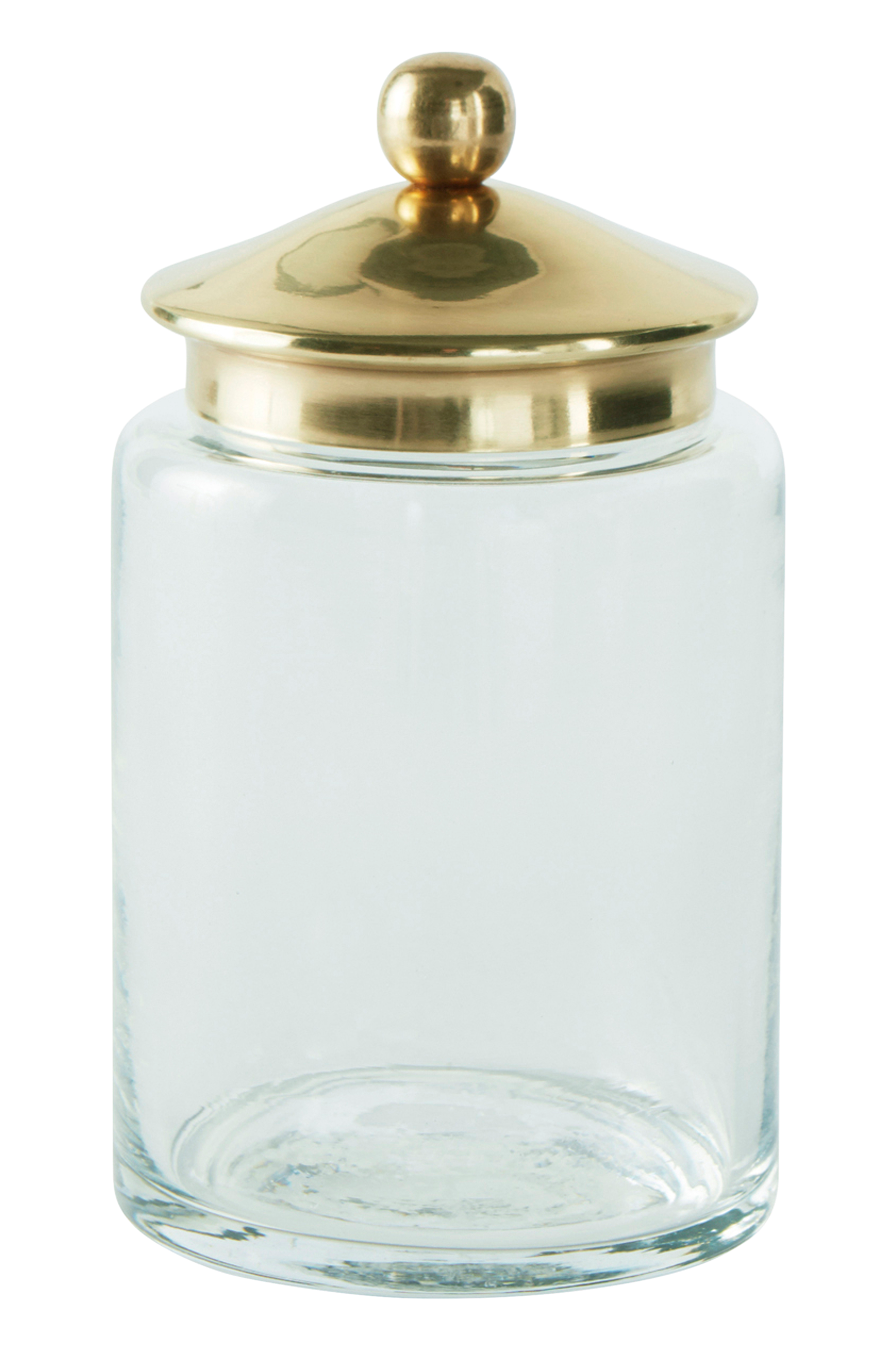 Dose aus Glas mit Metalldeckel. Der niedliche Deckel ist aus antikgoldfarbenem Metall.