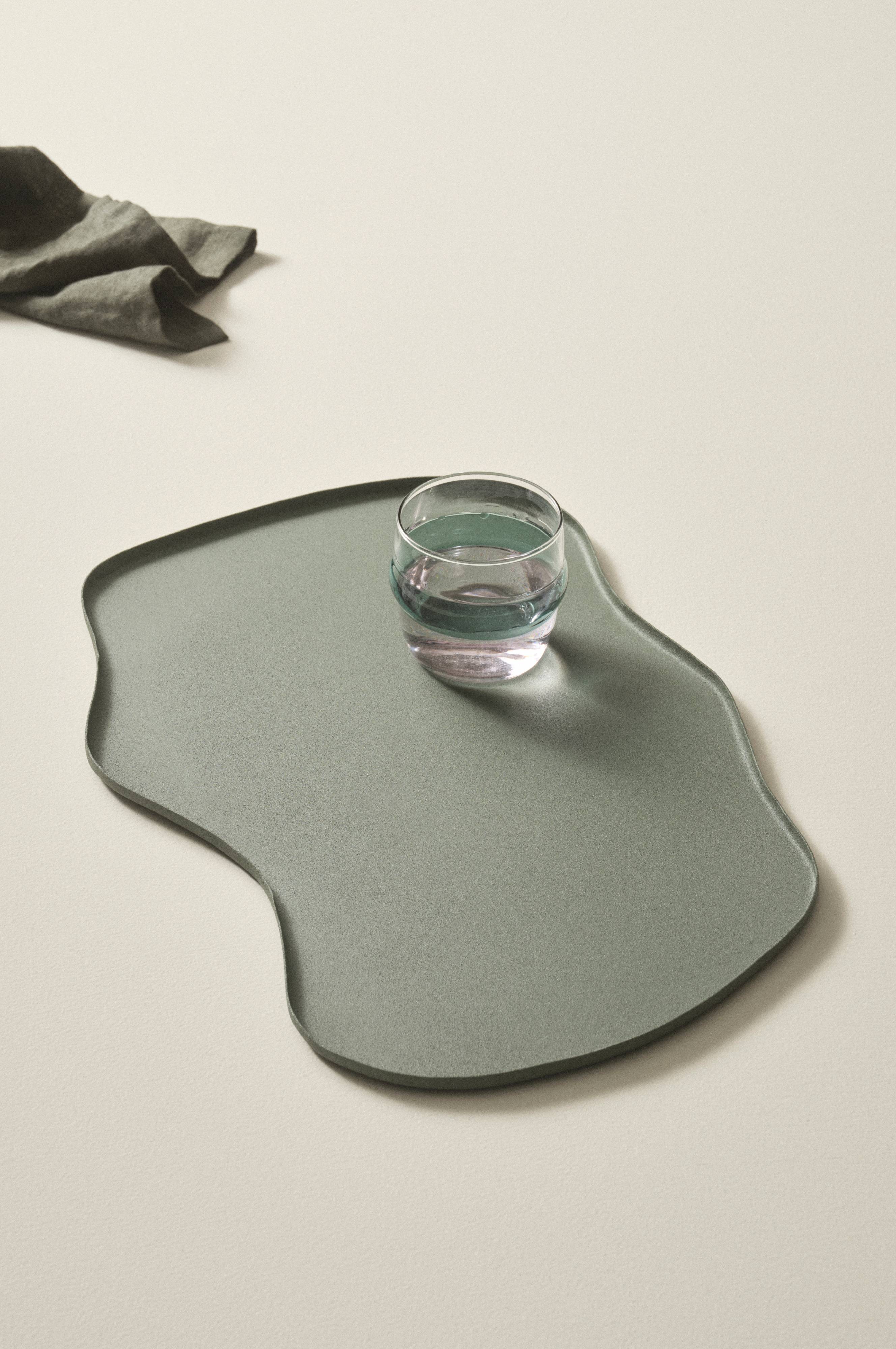 Tablett oder Servierplatte aus Eisen in einer unregelmäßigen, organischen Form. DREW ist wunderschön zum Anrichten und zum Servieren von Getränken oder Brot. Das pulverbeschichtete Tablett hat ein mattes Finish, das silberfarbene ist eher glänzend.