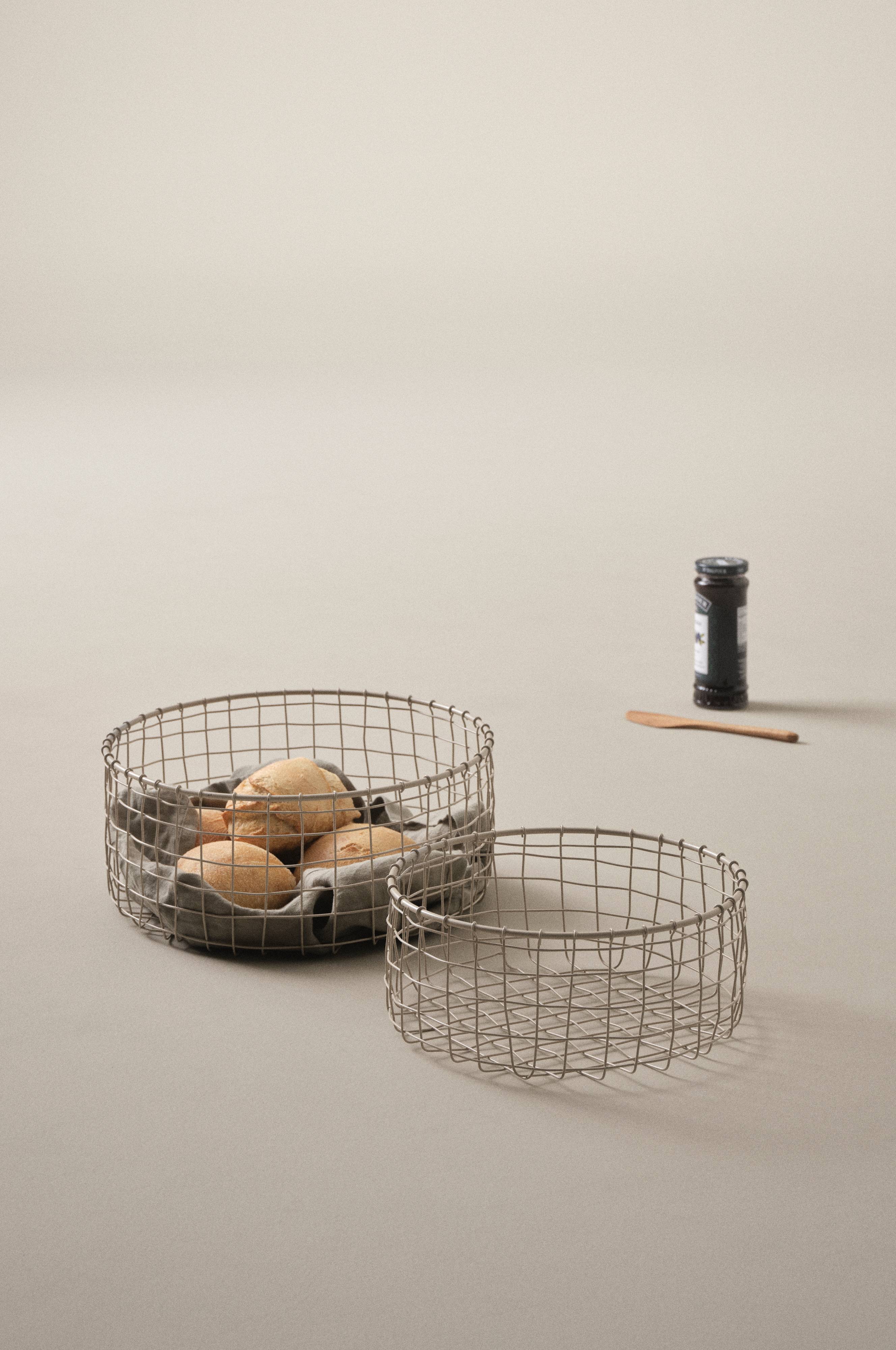 Bei diesen 2 Brotkörbchen wirkt das unregelmäßige Drahtgeflecht besonders reizvoll. Die hübschen Körbe sind unterschiedlich groß und eignen sich nicht nur für Brot und Brötchen, sondern auch für Eier, Obst uvm. Mit einer hübschen Stoffserviette oder einem Geschirrtuch ausgelegt, bleiben Krümel sicher im Korb liegen. Modell aus graulackiertem Metalldraht.