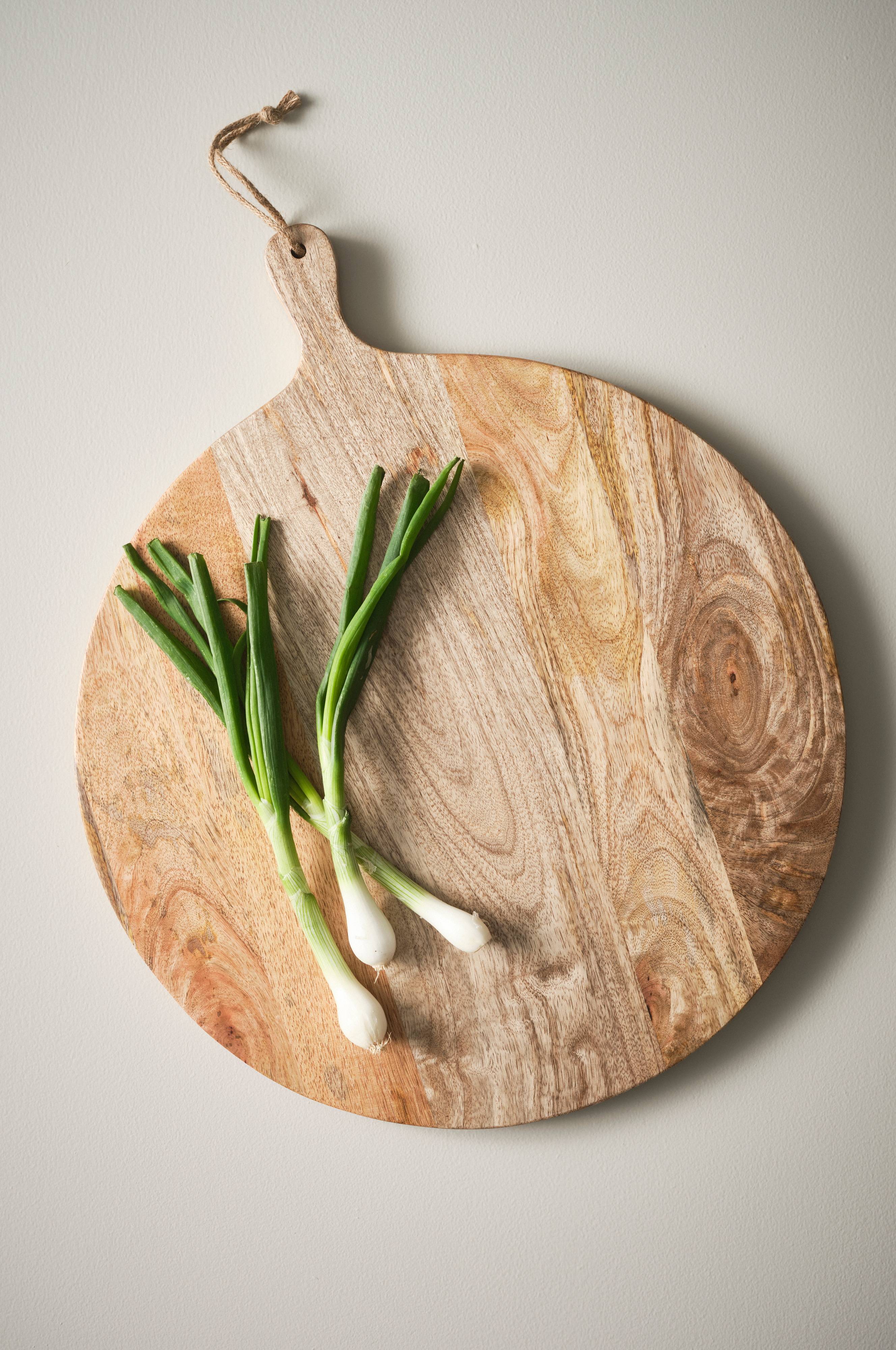 Schönes Schneidebrett aus FSC-zertifiziertem Mangoholz. Aufgrund der natürlichen Maserung des Holzes ist jedes Modell ein Unikat, und gerade bei einer unbehandelten Oberfläche treten die Variationen besonders markant hervor. Das runde Brett hat soft abgerundete Kanten und ein praktisches Aufhängeloch.