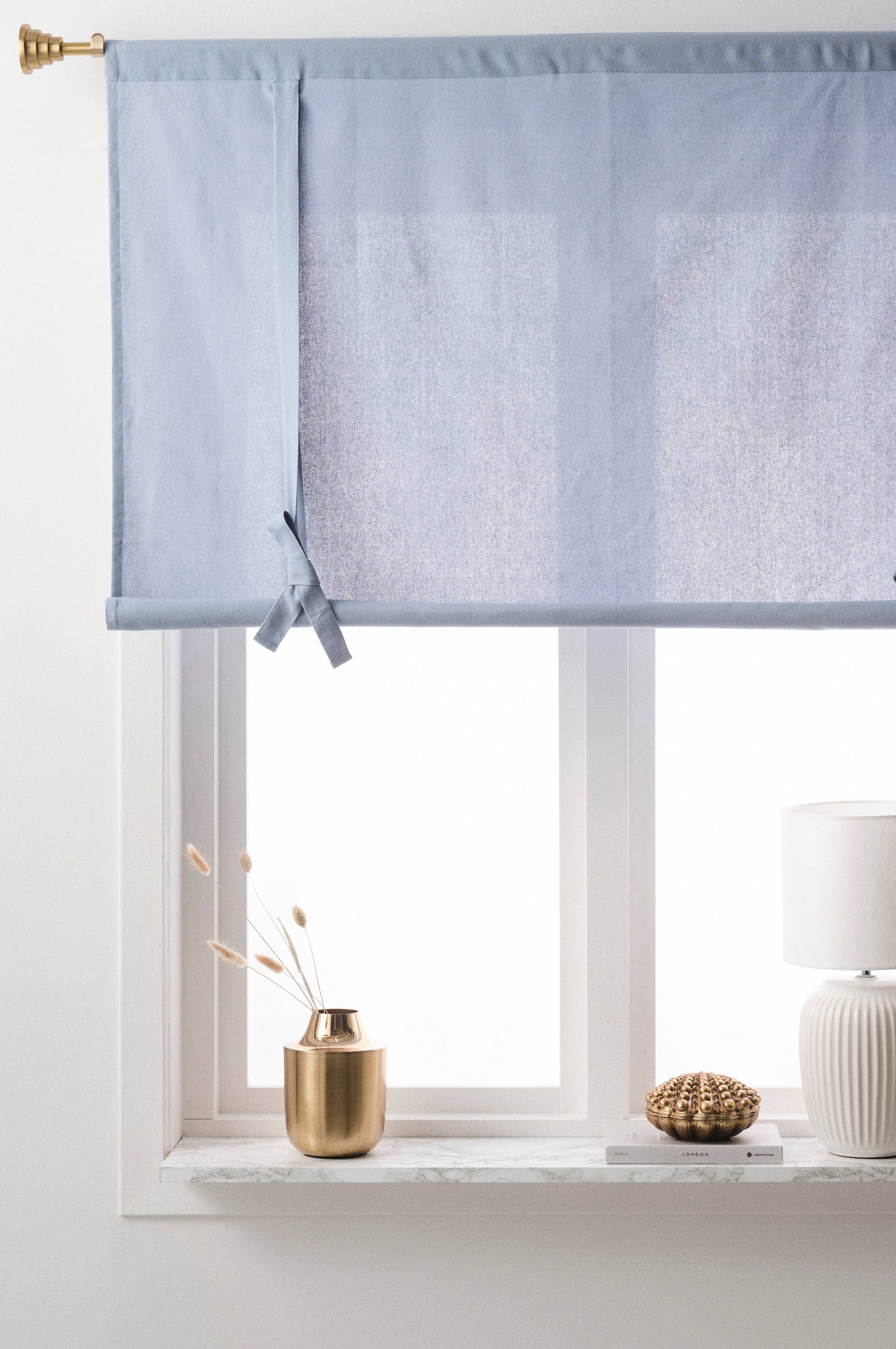 Rollgardine aus Baumwolle. Aufhängung an einer normalen Gardinenstange. Per Bindeband verstellbare Höhe.