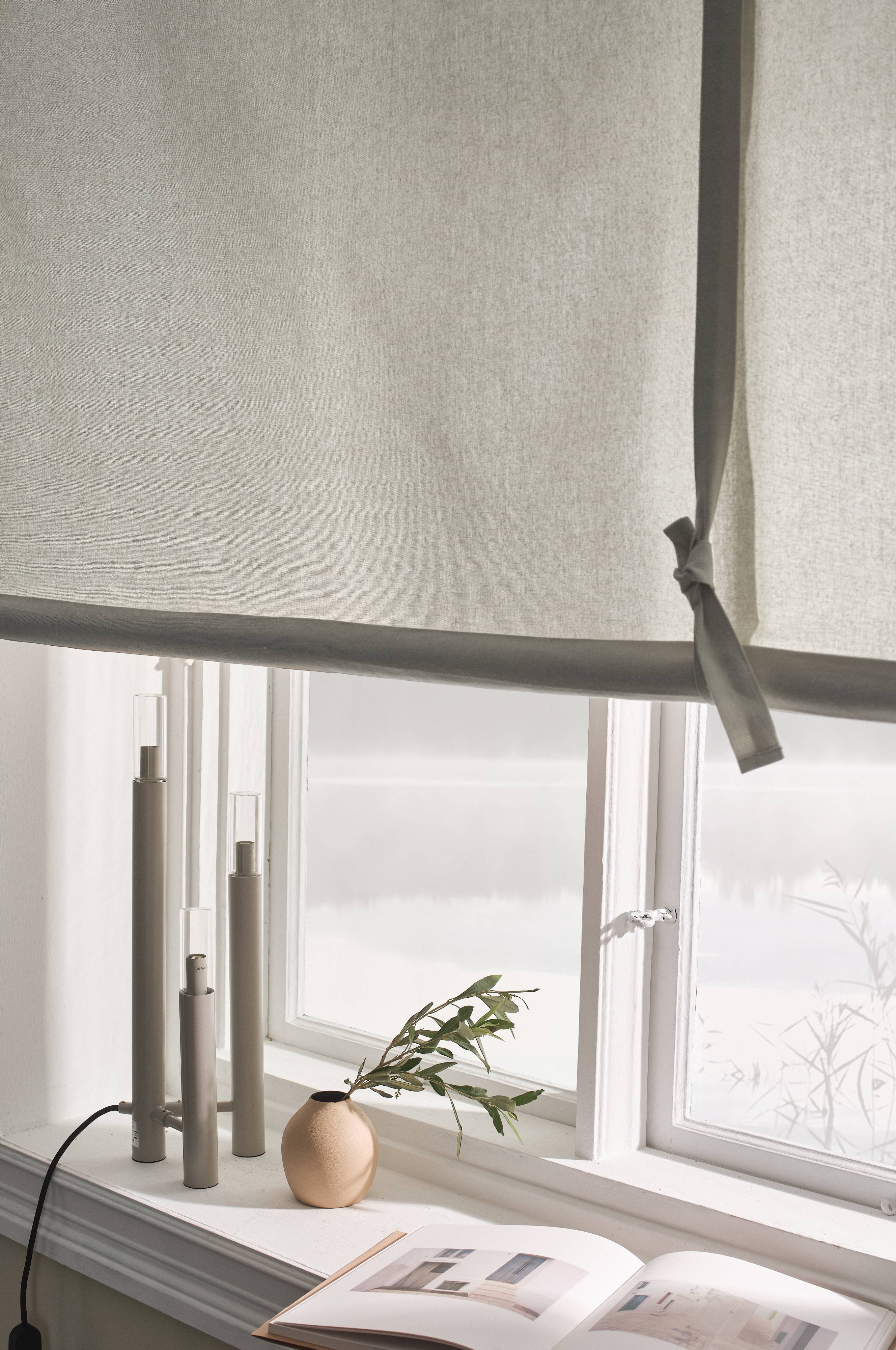 Rollgardine aus Baumwolle. Aufhängung an einer normalen Gardinenstange. Per Bindeband verstellbare Höhe.