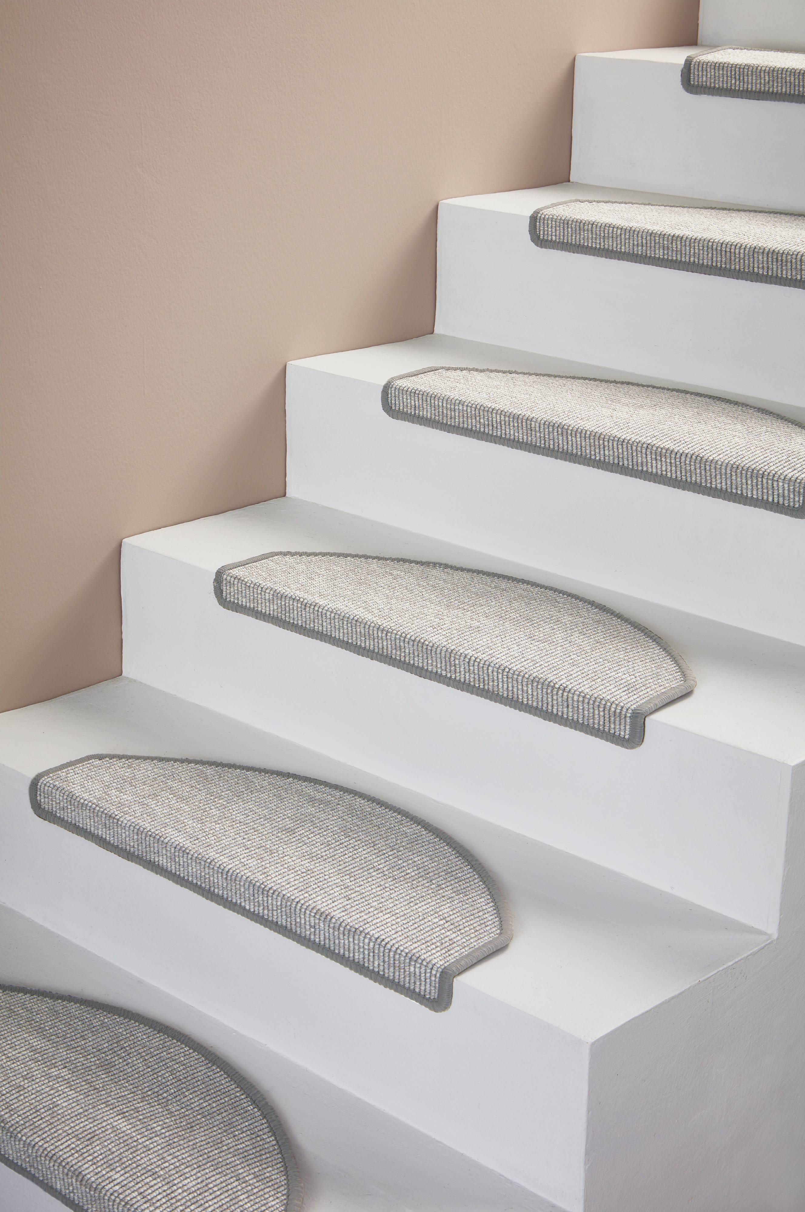 Stufenmatten (2 St.) aus Polypropylen/Polyester-Gewebe. ESCALIER verleiht deiner Treppe eine softe Optik und erhöht die Sicherheit dank der selbstklebenden Unterseite. Die einfarbigen, rechteckigen Matten eignen sich für die meisten Treppen. Eine rechtwinklige Kunststoffschiene mit doppelseitigem Klebeband sorgt für die sichere Positionierung. Dicke: 6 mm.