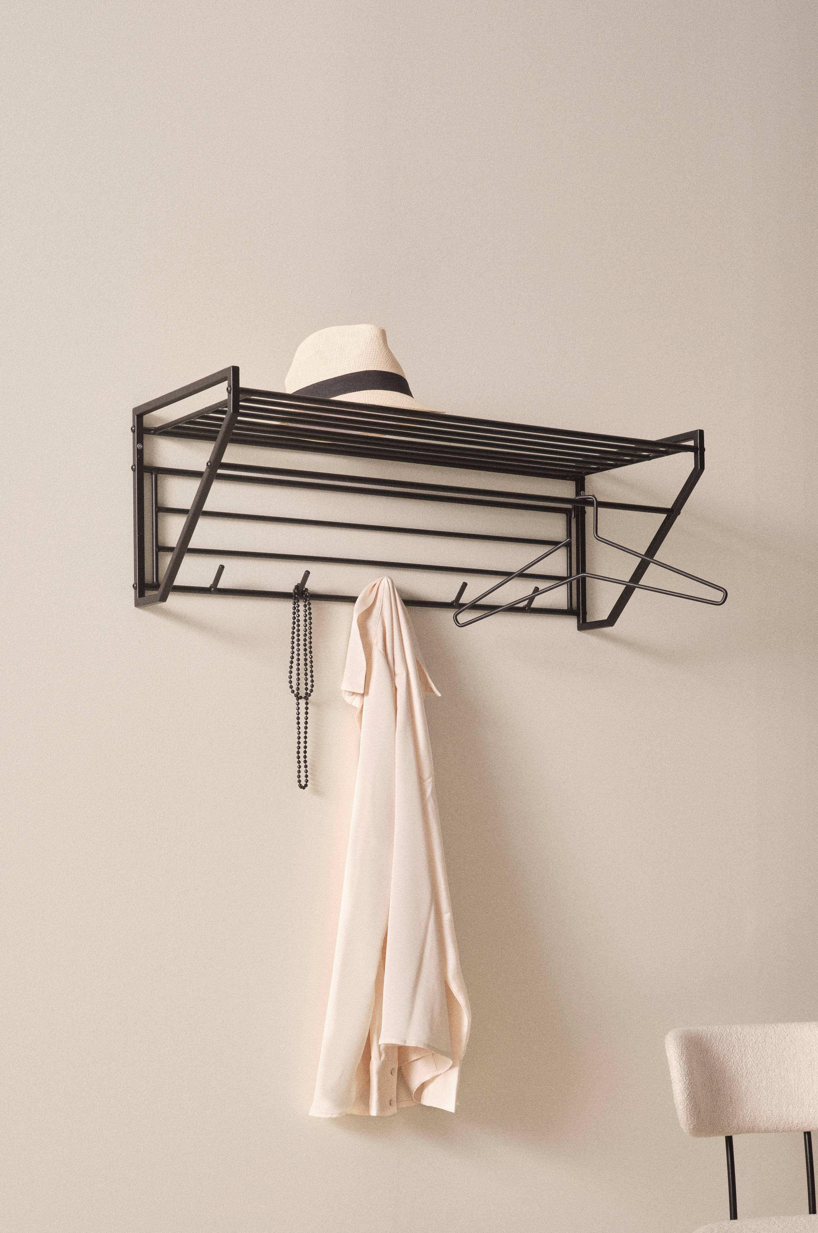Hutablage aus matt pulverbeschichtetem Stahl. EVERLY hat Seitenteile aus Vierkantprofilen und eine Ablage aus Rundstäben - ein klassisches, unkompliziertes und langlebiges Modell. An der Stange vorn kannst du Kleiderbügel, aber auch Schals und Tücher aufhängen. Inklusive Wandhalterung. Schrauben nicht enthalten. Einige Montageschritte sind erforderlich. Inklusive Montageanleitung. Kleiderbügel separat erhältlich.