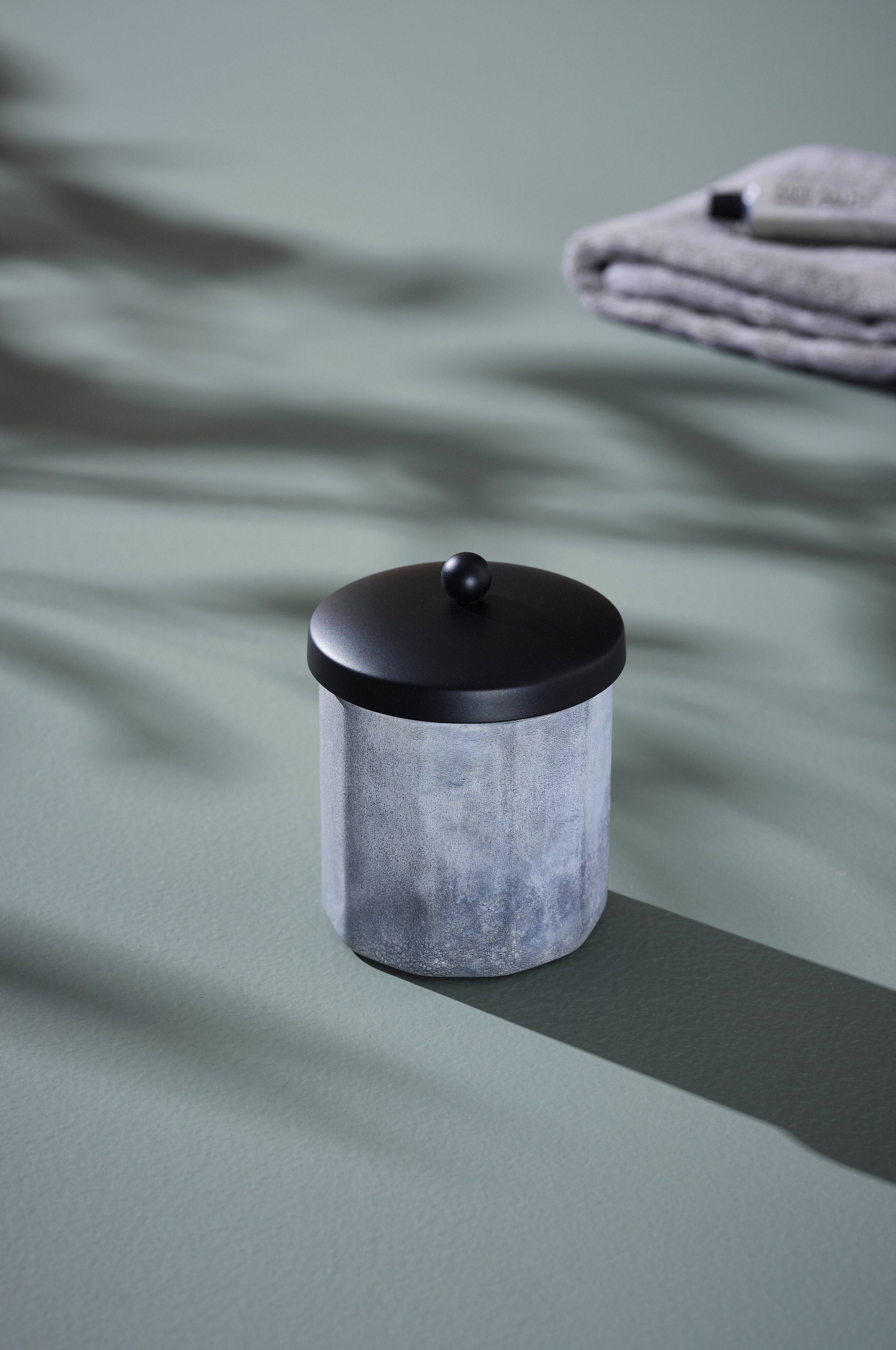 Bei dieser Dose ist der Behälter aus Glas, der Deckel aus Messing mit mattschwarzem Finish gearbeitet. Zehneckiger Behälter aus gefrostetem Glas. Die kleine Dose ist ein Schmuckstück im Badezimmer. Ideal zum Verwahren von z. B. Wattebällchen oder Schmuck.
