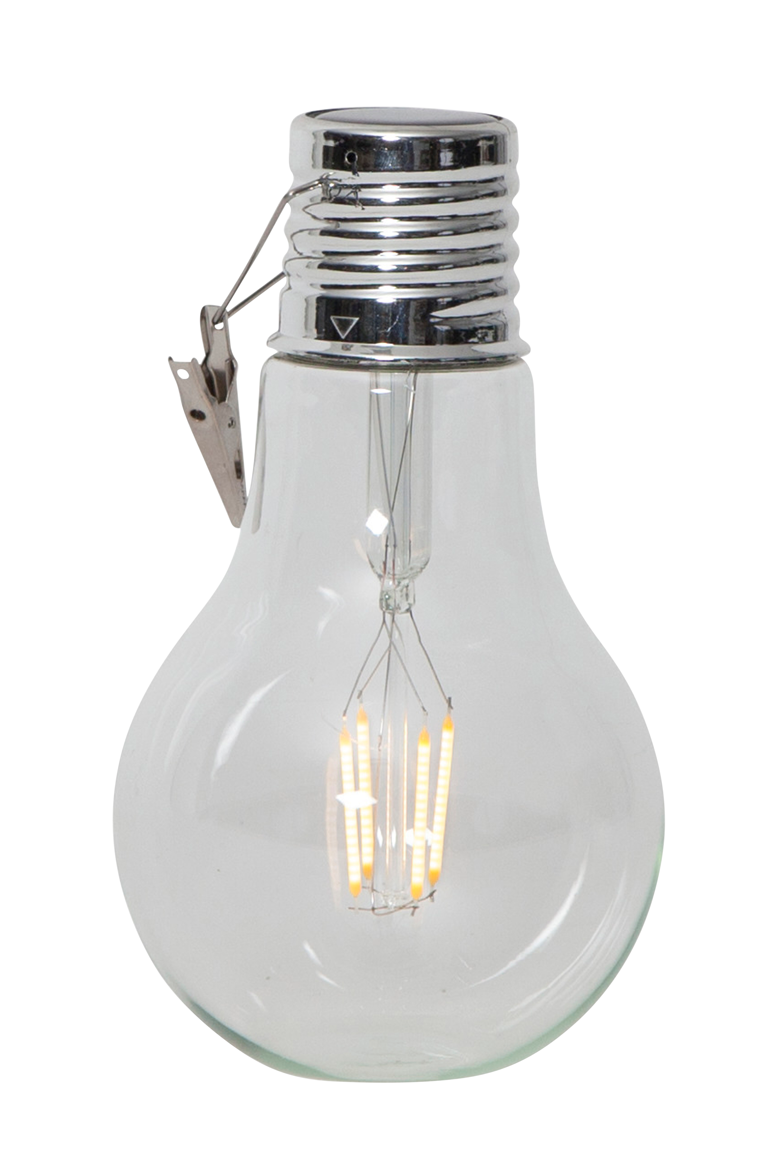 Hängende Solar-Dekoration in Form einer Edison-Lampe. Das LED-Filament hat einen Lichtstrom von ca. 5 Lumen. 1 Batterie 23 AAA NIMH (aufladbar) ist enthalten. Lebensdauer ca. 4 h. Größe: 10x18x10 cm.