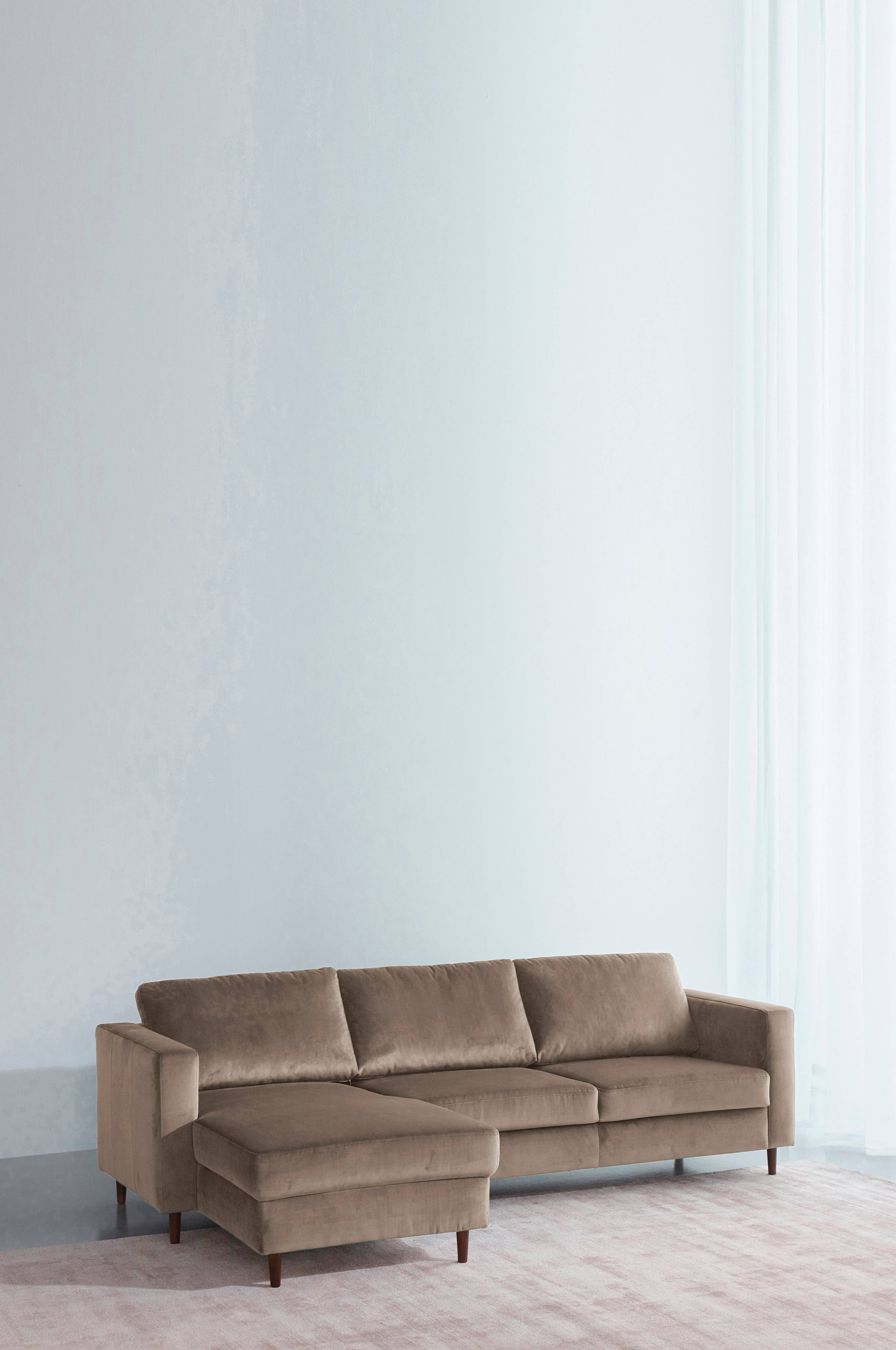 Bei unserem FRANCIS 3-Sitzer-Sofa mit Longchair sprechen die schlichten, klaren Linien eine unverkennbar skandinavische Formensprache. Der Longchair lässt sich rechts oder links ansetzen. FRANCIS hat einen unempfindlichen Bezug aus Polyestersamt und Beine aus Holz. Auf der stabilen Basis aus Kiefern- und Furniersperrholz sorgen eine bewährte Kombination aus Kaltschaum, Zickzackfedern und Gummigurten sowie die bequeme Polyesterfüllung für besten Sitzkomfort, zu dem auch die glatt gearbeiteten Rückenkissen ihren Teil beitragen.