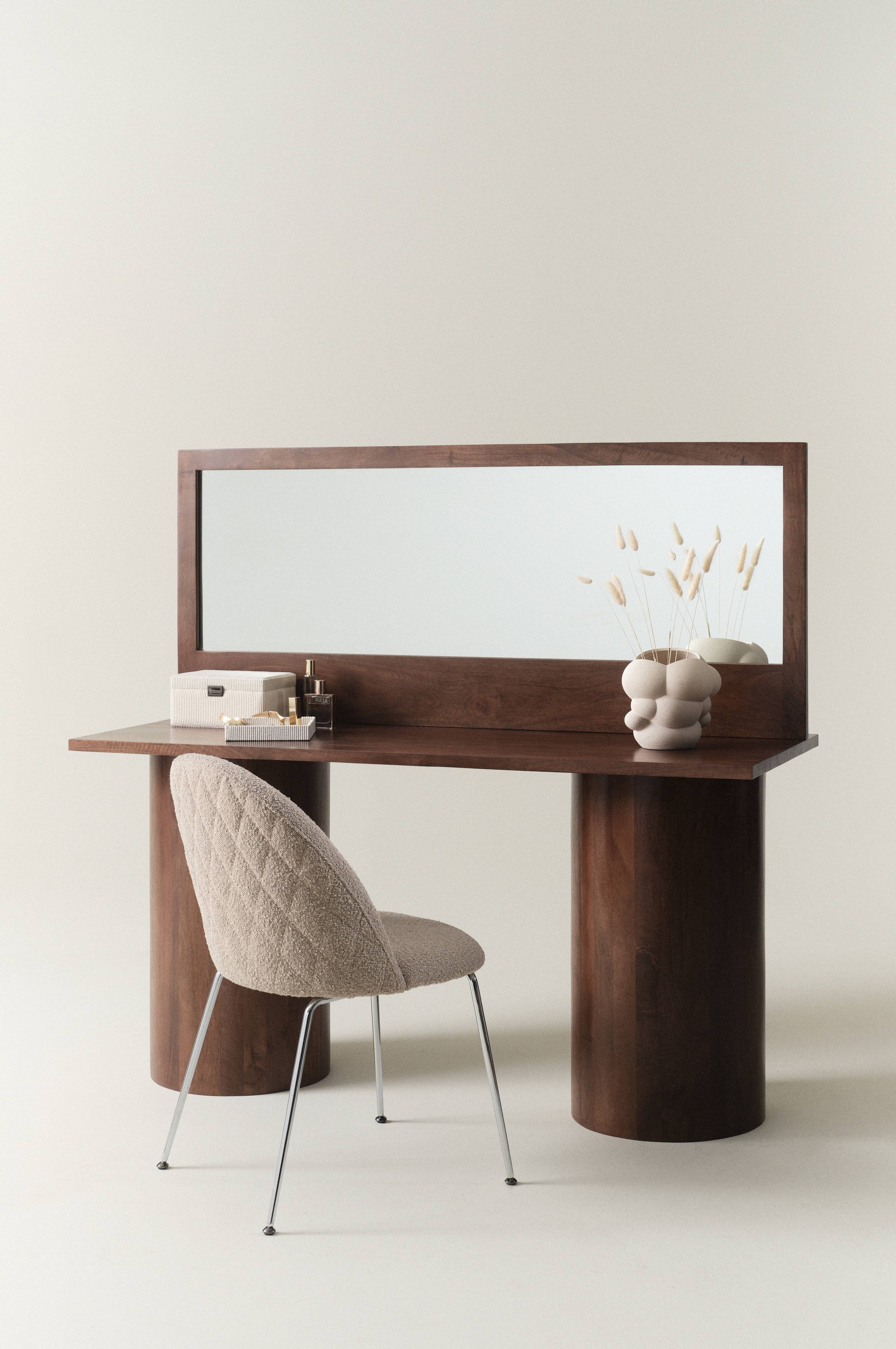 Schnörkelloser Schminktisch mit Spiegel, aus massivem Mangoholz und MDF. Bei diesem Schminktisch sorgen die kräftigen runden Beine für die imposante Optik, die sich vor allem in einem größeren Schlaf- oder Ankleidezimmer gut macht. Hier werden der skandinavische und der japanische Stil im kontrastierenden Mix aus geraden und runden Formen gekonnt kombiniert. Ein schönes Finish rundet das Modell ab. Einige Montageschritte sind erforderlich. Inklusive Montageanleitung.