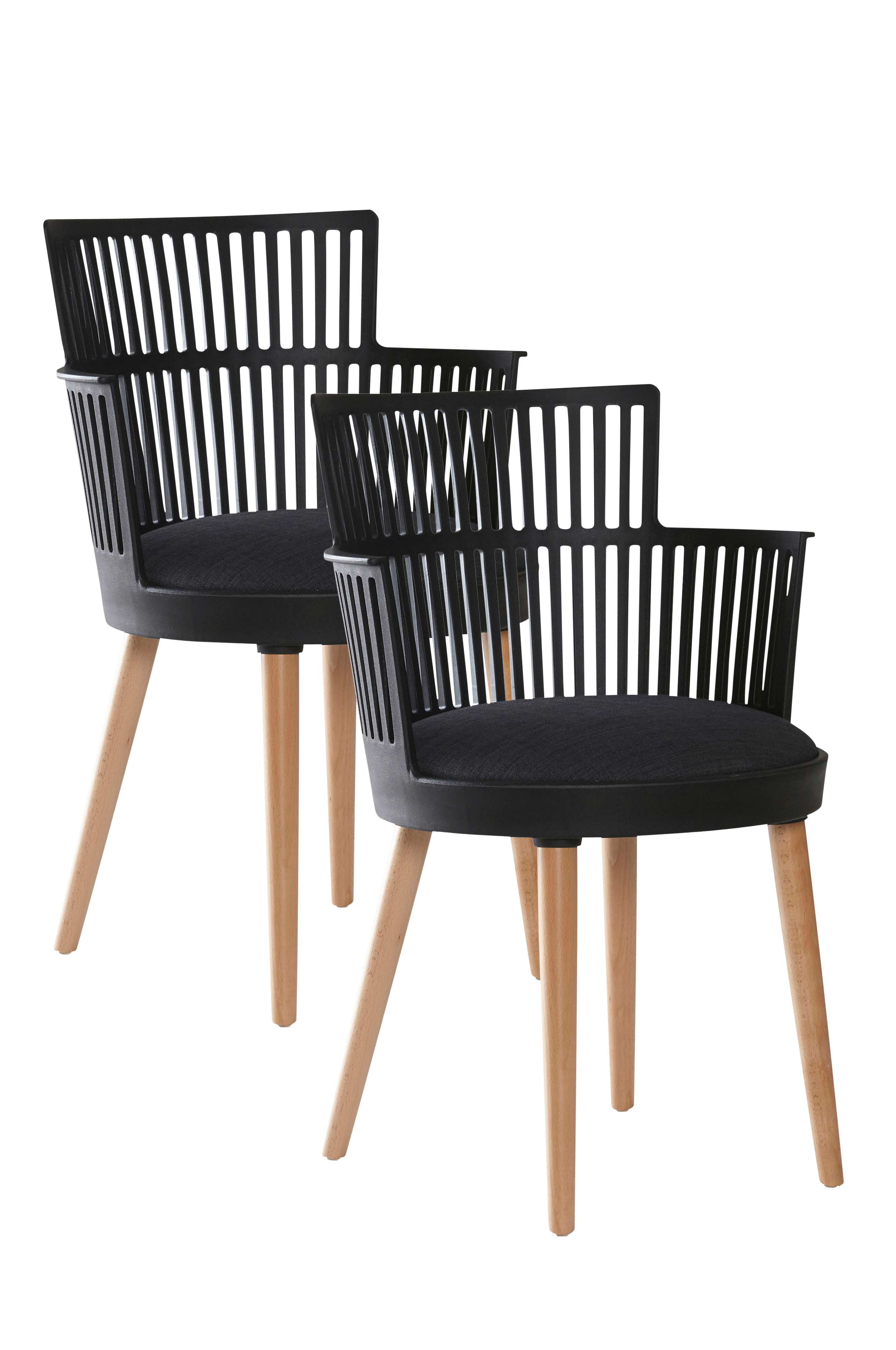 2er-Pack Stühle mit einer Rückenlehne aus Polypropylen, einem gepolstertem Sitz mit Polyurethanschaum-Füllung und Polyesterbezug und Beinen aus massiver Birke. Dieser moderne Stuhl besticht durch seine runde Formgebung, die Armlehnen und den hohen Sitzkomfort. Mit seiner schlanken Lehne kann sich dieses schmucke Möbel nicht nur am Esstisch, sondern auch als Solitär im Flur sehen lassen.